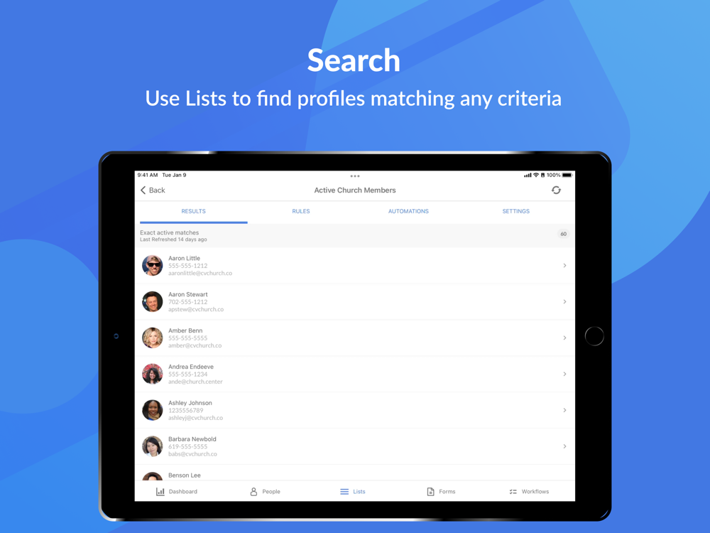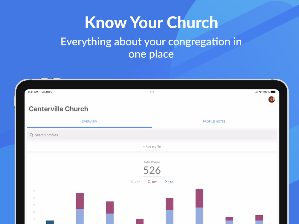 • View, create, and edit membership info and photos about the people in your church.
