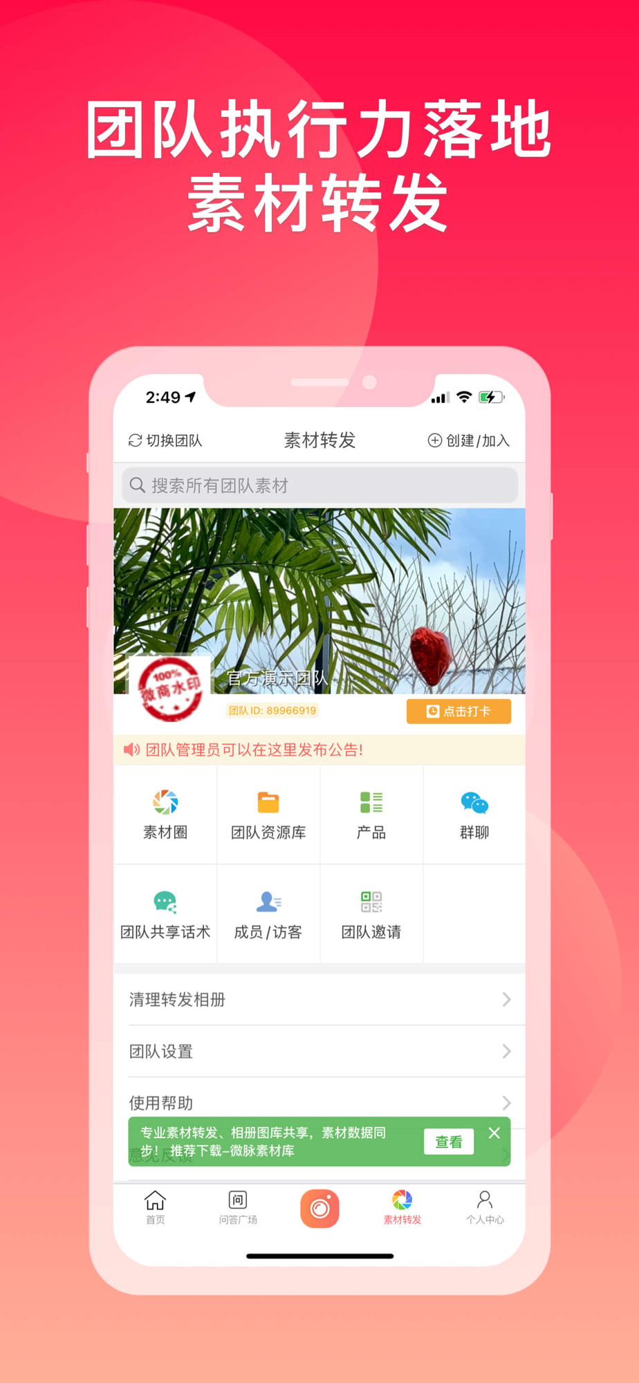 10.素材转发:通过创建团队,让代理、成员可以共享和转发素材;