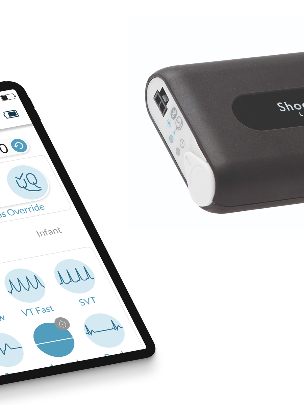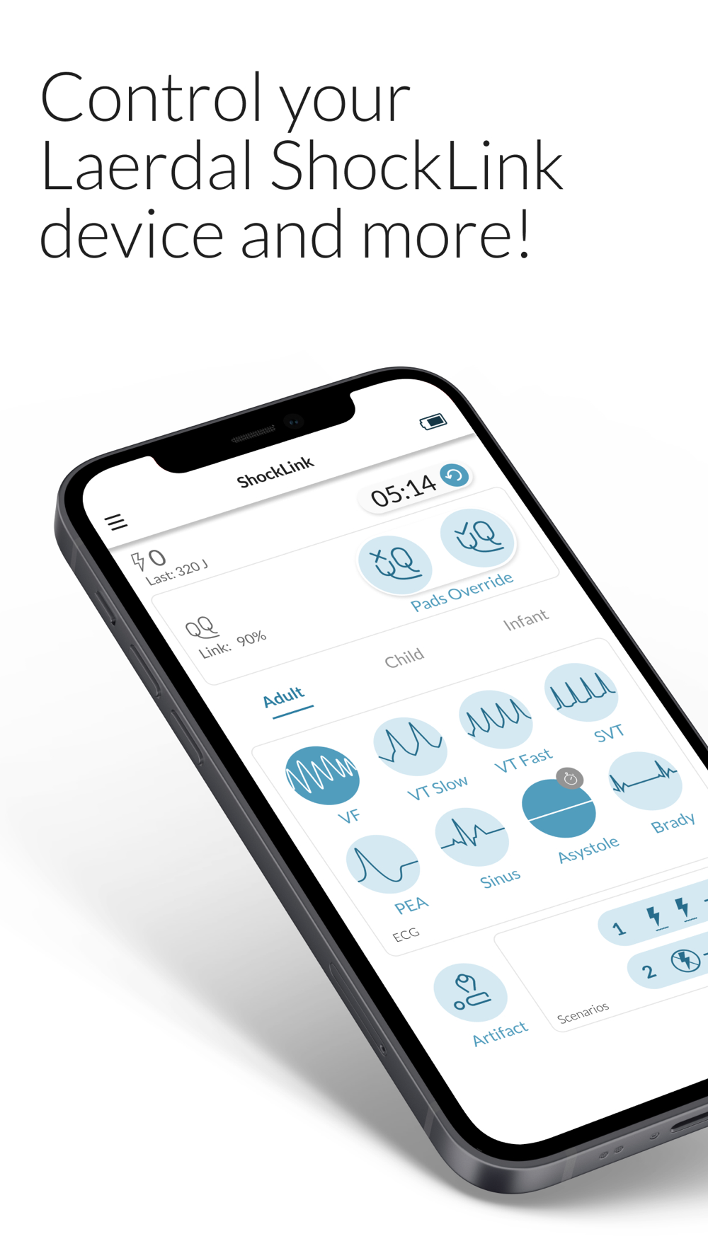 With the ShockLink app, users have control over ShockLink pad placement, two pre-set scenarios, CPR artifact, and eight rhythms for adult, child, and infant: VF, PEA, Brady, Asystole, VT slow, VT fast, SVT and Sinus