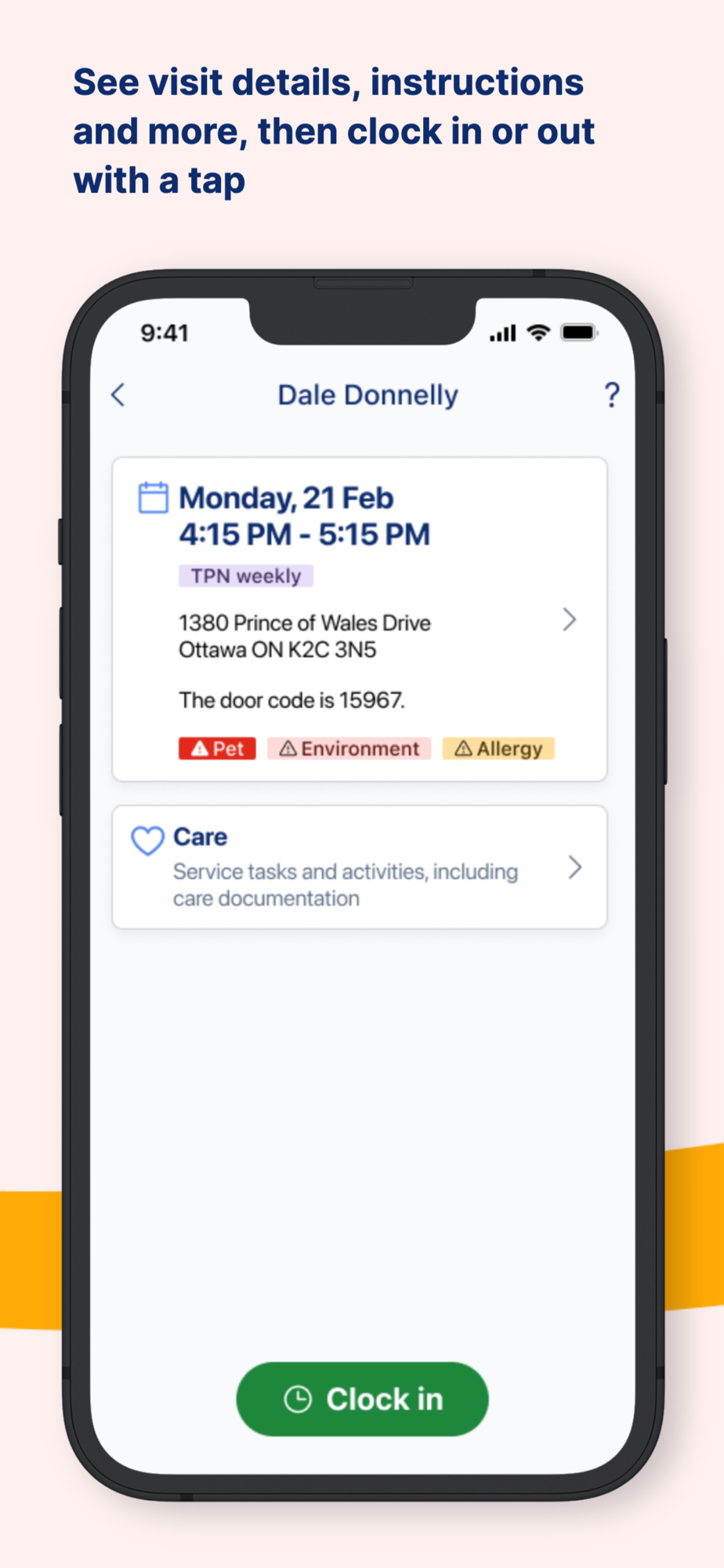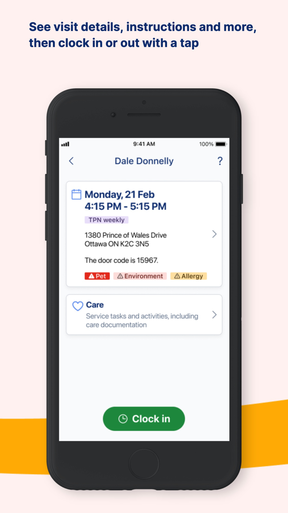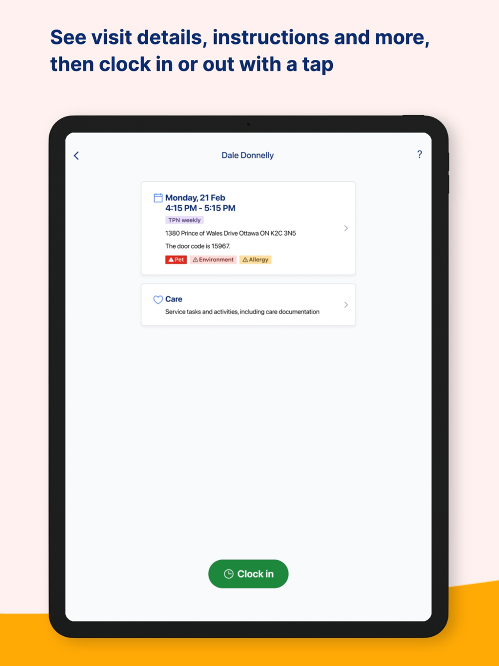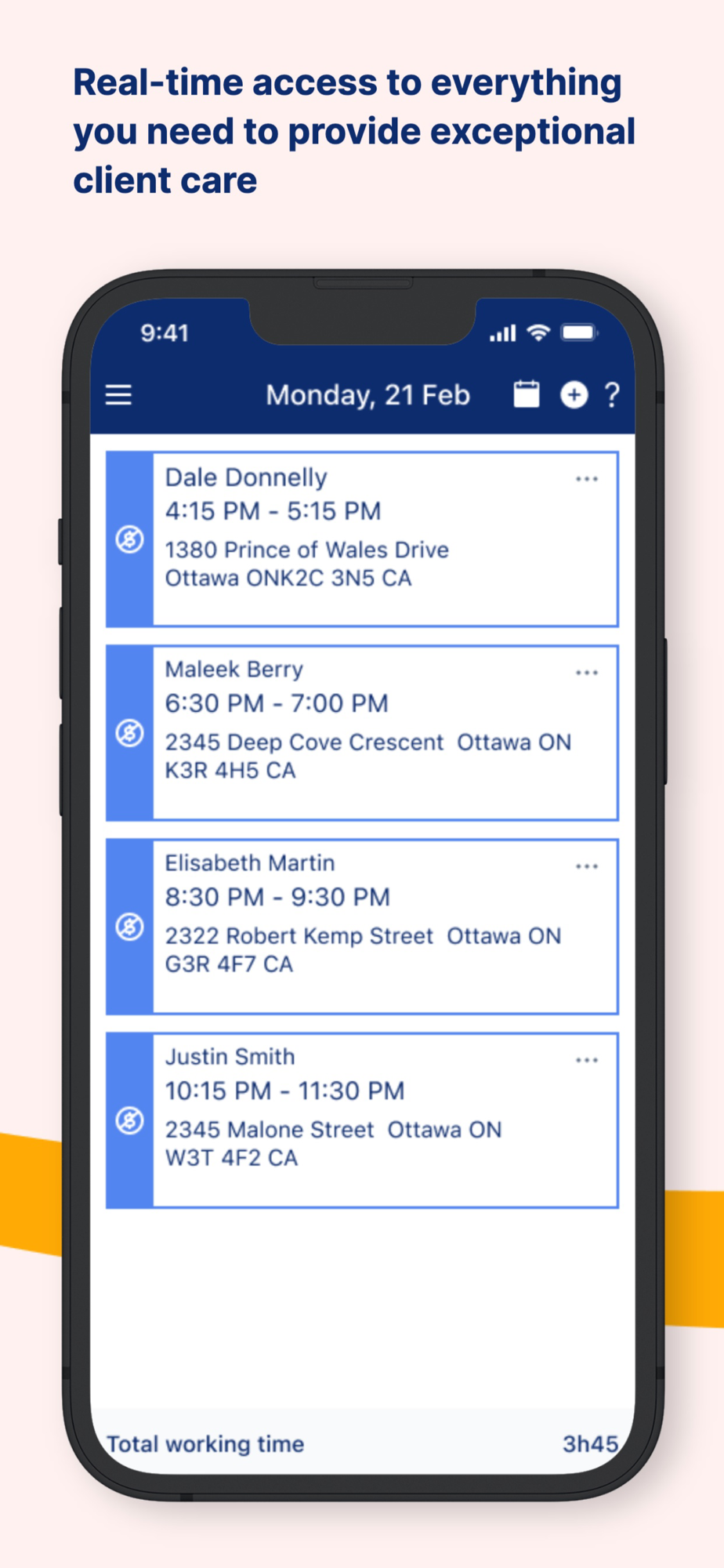 The AlayaCare Care Worker app makes it easy for care workers and nurses to access and track client health and fitness. Real-time scheduling, time tracking, charting and clinical documentation are all at your fingertips, so you can deliver exceptional health care.