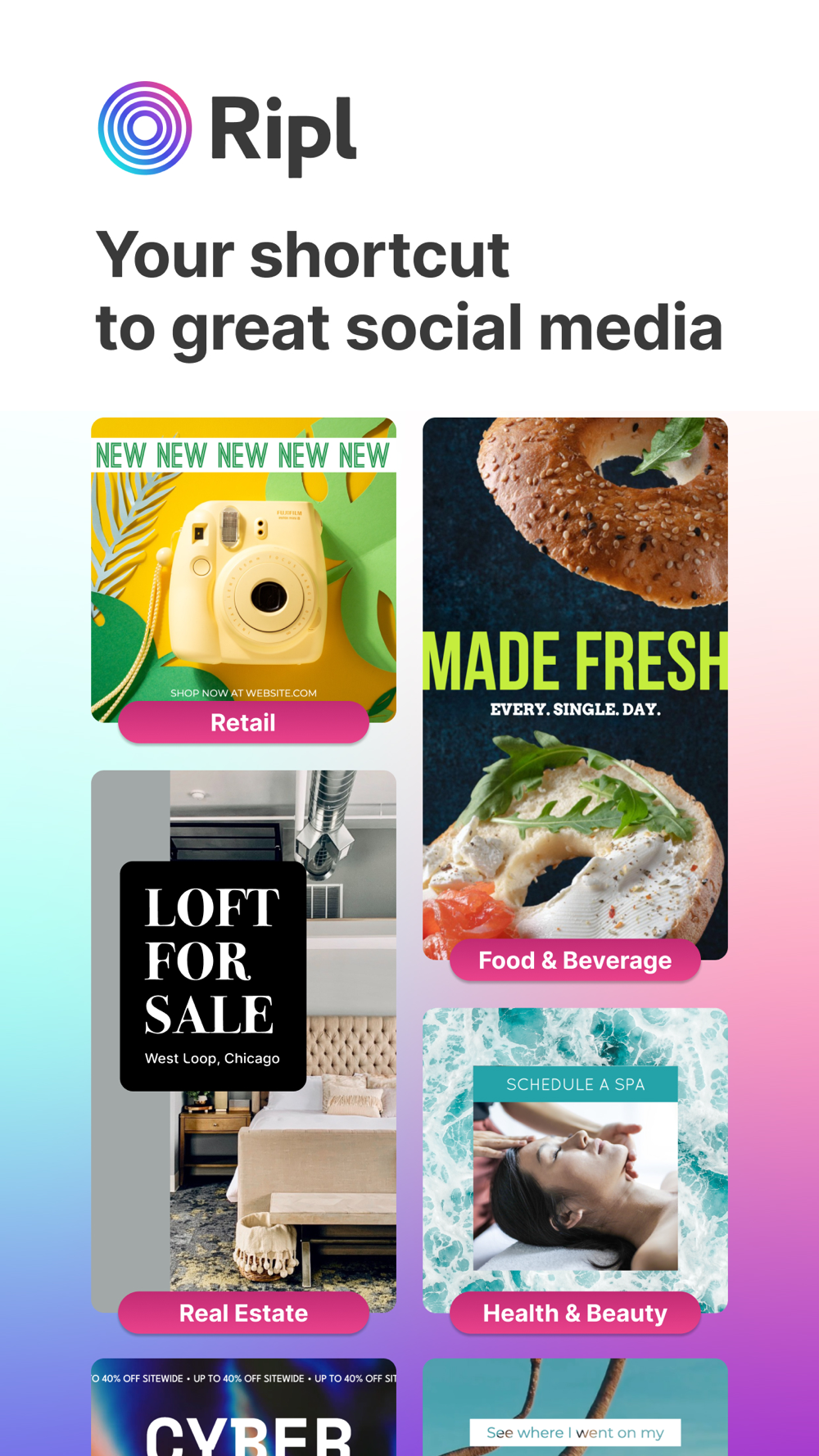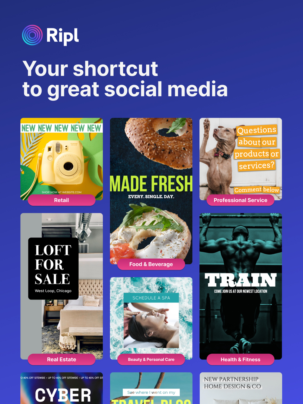 Ripl's templates are made to help your business stand out in Instagram stories, Facebook ads, or social flyers.