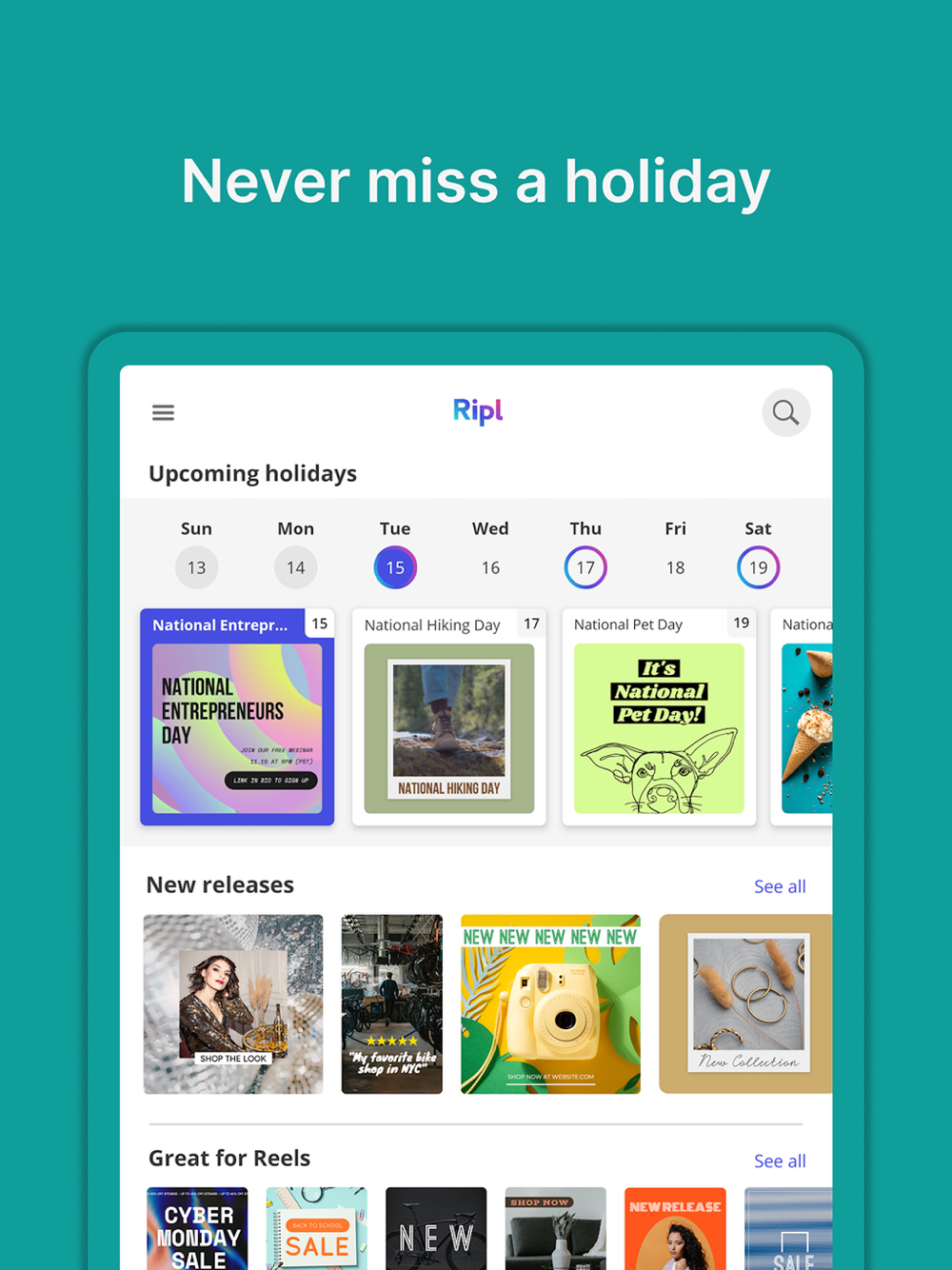Ripl lets you easily create, post, schedule, and track professional-looking social content in just minutes.