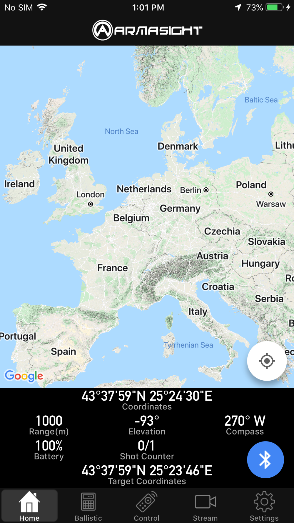The application allows hunters and others to pinpoint their position, their direction of aim, and geo coordinates by Geotagging of the target when using Armasight optional clip-on rangefinder or unit's integrated, using both terrain map or satellite map features on their respective mobile device. In addition to that, Armasight App allows users to select a tab for system level remote operations to change all functions normally reserved for the wireless remote via cell phone in a very simple and intuitive graphic interface. Also there is option for Kestrel 4500/5500 series weather station data directly to the mobile device and ballistic calculations based on the received data. The application also supports real time video stream over Wi-Fi for numerous Armasight devices.
