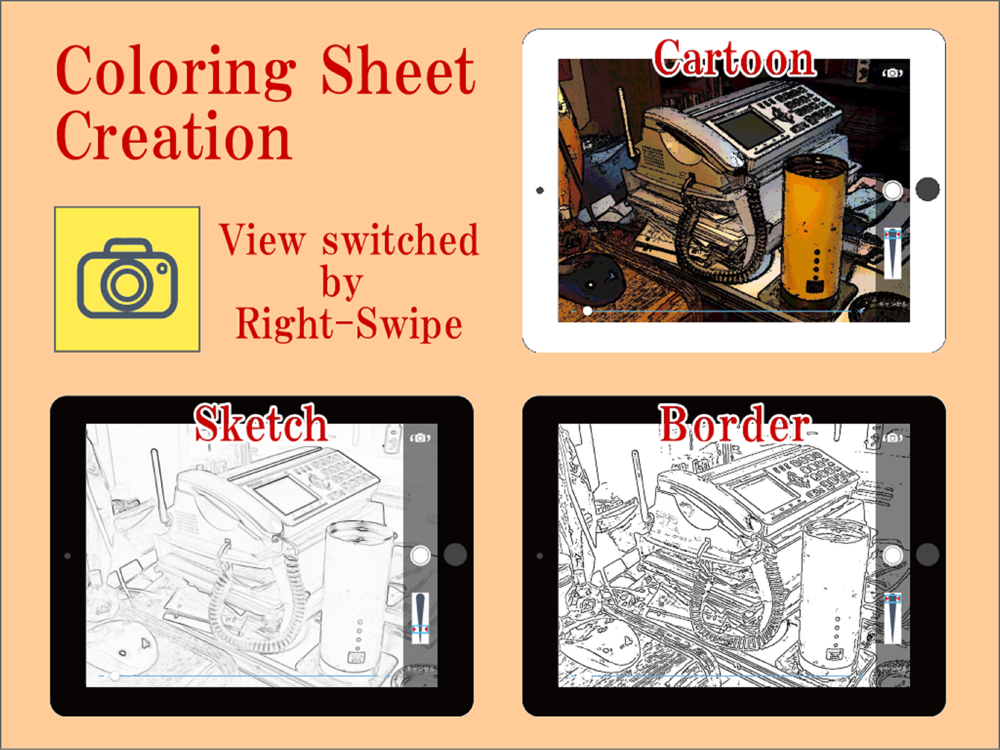 - Filtered Images include "Sketch", "Border", "Cartoon" which are switched by right-swipe with front/rear camera swap.