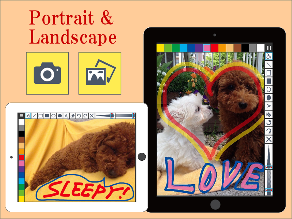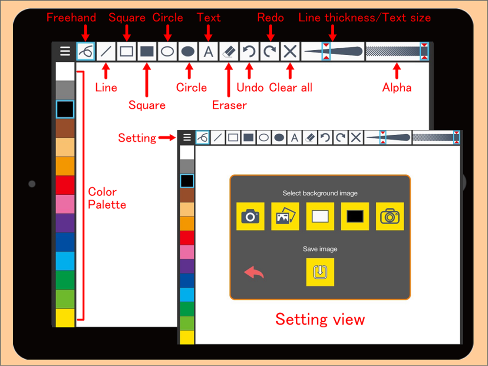 A camera shot or a photo in photo library of your iPad can be used as a background of painting. Paint over the background image, then save it to photo library of your iPad. The filtered images such as "Sketch", "Border", "Cartoon,"which this app provides by image processing, also can be used.