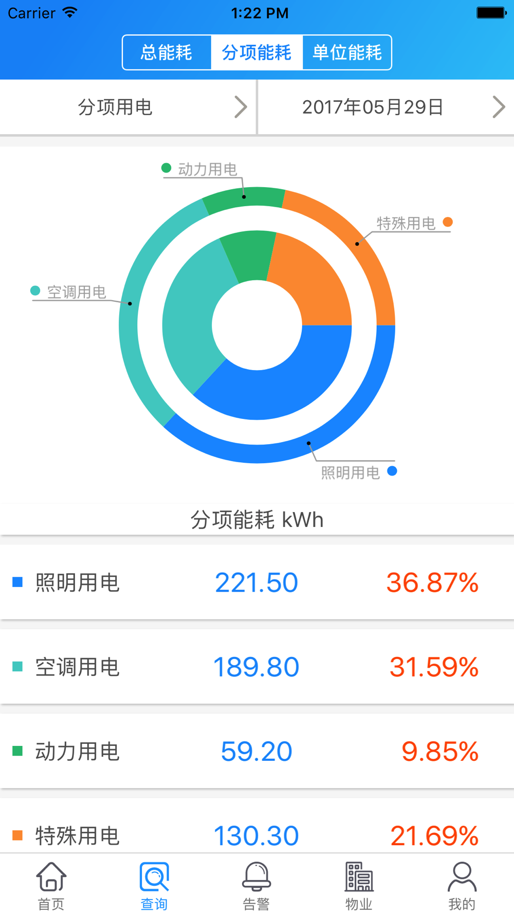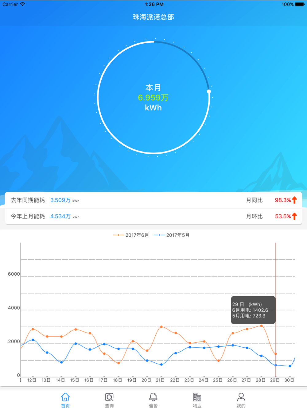 2、查询不同能耗指标,如:环比、同比、单位面积能耗等。