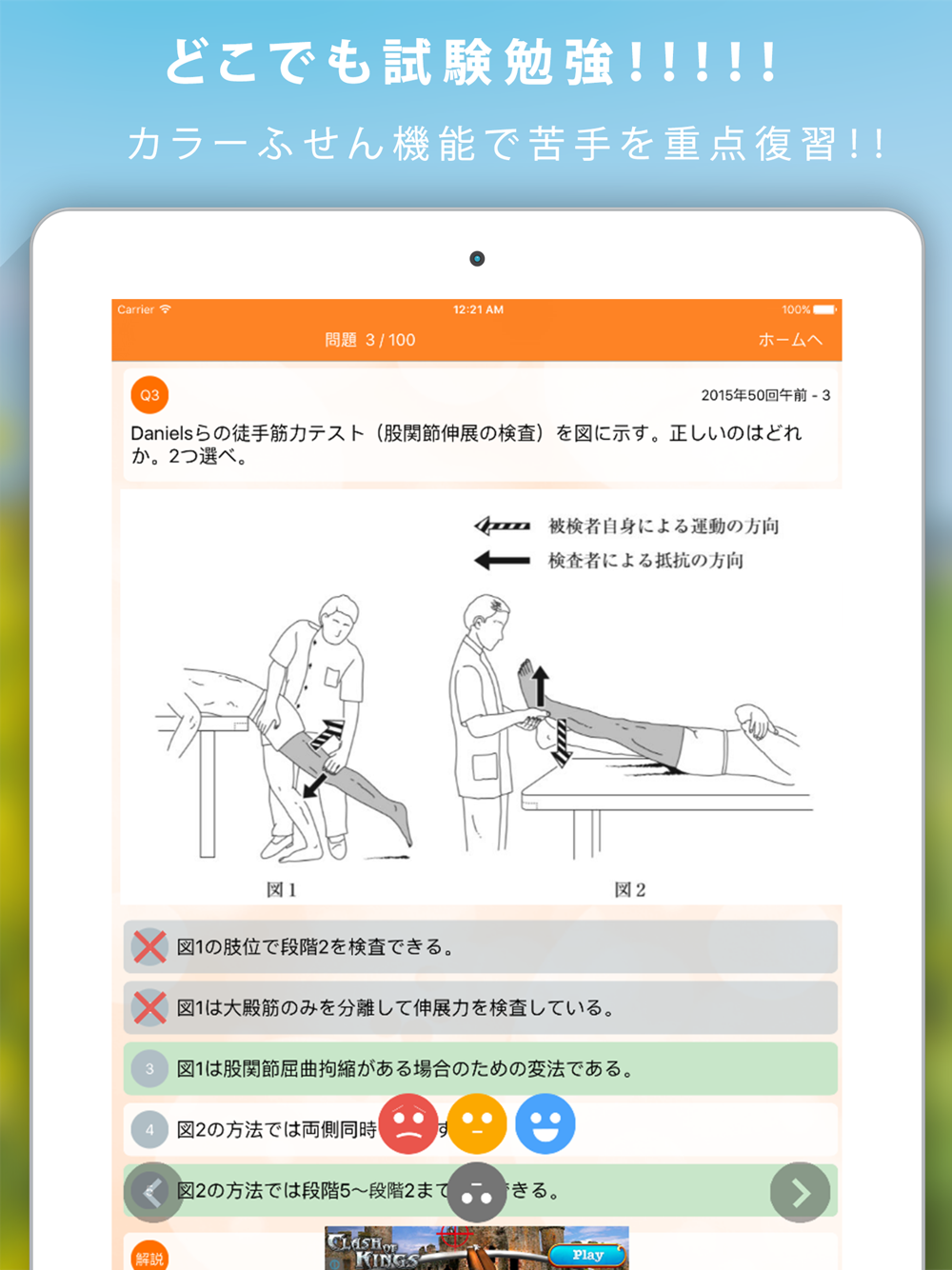 開催別、分野別、苦手な問題などから独自の問題セットを作成することができ重要な項目を徹底的に勉強できます。復習用にカラー付箋(ふせん)を使用したり、間違い回数が多い問題だけを解けるのでスキマ時間に、いつでも、どこでも効率的な学習が可能です。成績機能も充実しており、解答率、正解率、分野ごとの分析されます。