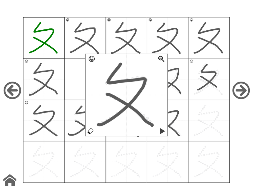 *筆順不正確或沒有好好寫,會顯示苦惱的臉,提醒家長注意該字