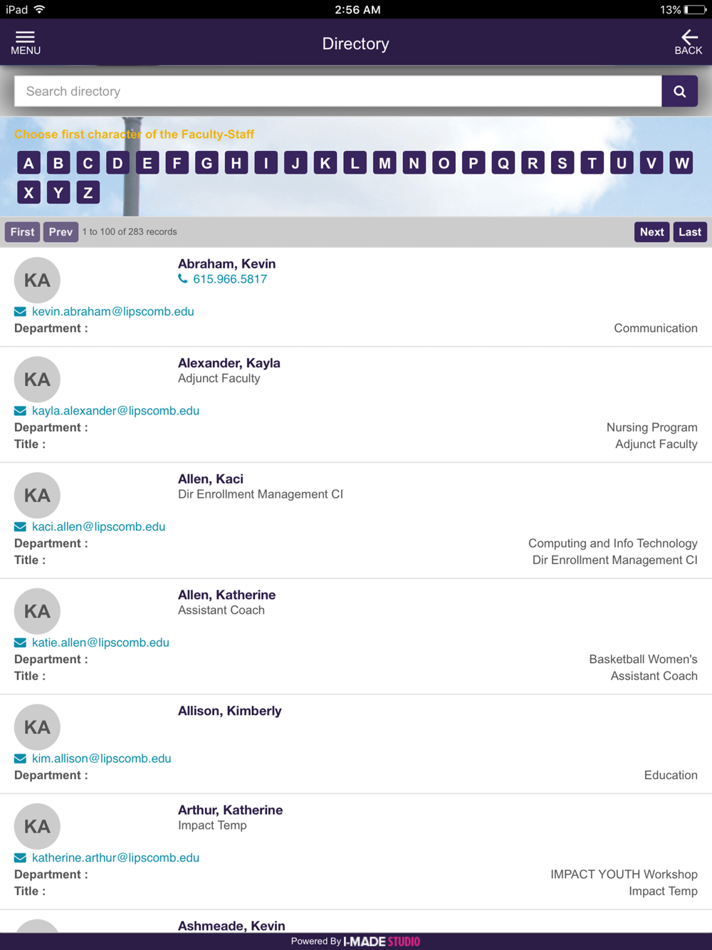 myLipscomb helps you stay connected to Lipscomb University from wherever you are. Get access to your courses, grades, class schedule, stay informed with the latest campus happenings, find people in the public directory, get in touch instantly, find places on the campus map, get alerts, send messages and more.