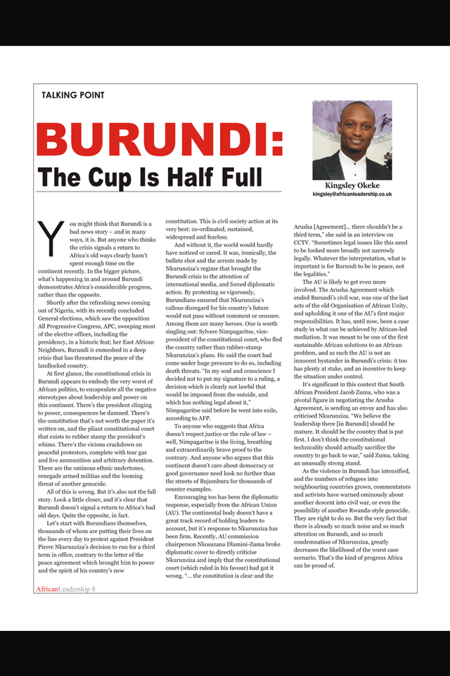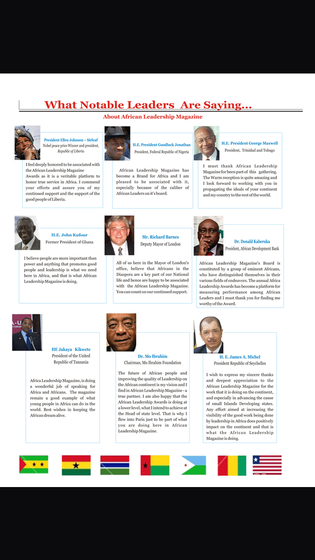 Since its maiden edition in August 2008, African Leadership Magazine has grown to become a leading pan-African flagship leadership-focused publication read by over 240, 000 targeted international investors, business executives, government policy makers and multilateral agencies across Africa, the Middle East and Asia, Europe and the US. It is distributed at major international and African Leadership events around the world. It is a niche and unbiased African voice born out of a desire to ameliorate the lot of Africans by focusing on individuals and corporate bodies that are known for their legacy-based approach to leadership. We believe in building sustainable leadership in Africa through exchange of ideas in tandem with global best practices. The magazine shall continually seek to herald the dawn of a new Africa as the continent of promise and global leadership, championed by people of integrity and resilience who are rising from the challenges of an unpleasant past; thereby preserving a legacy for future generations of our people.