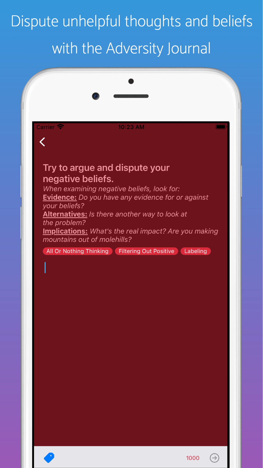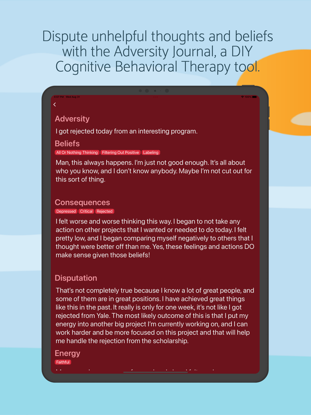 The Adversity Disputer, inspired by the work of renowned American Psychologist Martin Seligman, is a tool for DIY Cognitive Behavioral Therapy, or CBT. The Adversity Disputer will teach you to combat negative self-talk and reprogram your brain to respond in a more productive way in the face of life's challenges.