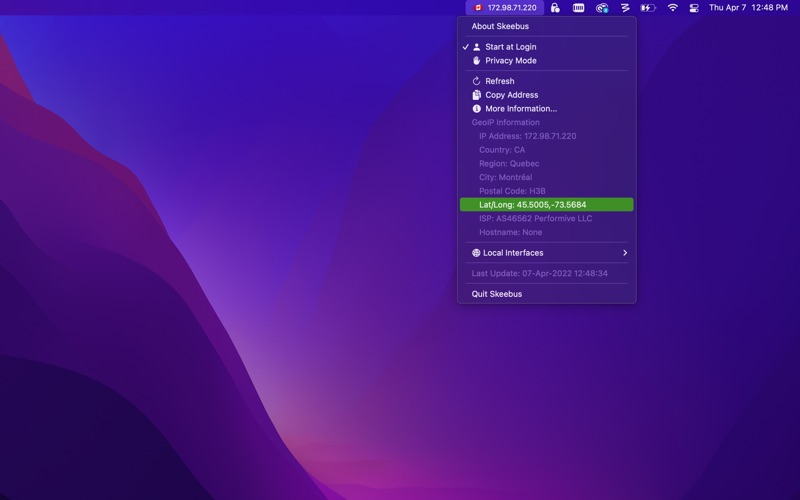 If Skeebus is unable to contact the GeoIP provider, it will fall back to another provider and determine your IP address without the GeoIP information. The app does not periodically contact either provider to update your address; rather, it automatically updates any time an interface state changes (a cable is plugged in/unplugged, wireless is connected/disconnected, a VPN is connected/disconnected, etc.). You can also manually refresh the data at any point.