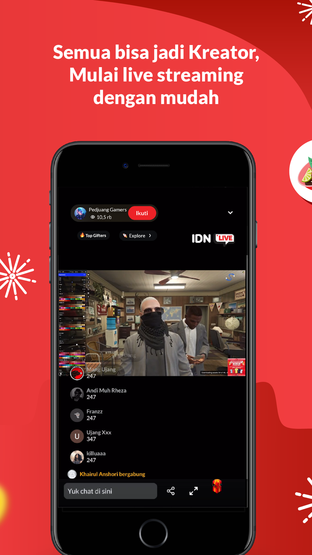 Bukan cuma jadi penonton, kamu juga bisa buka live room dan jadi live streamer! Mulai dari streaming game, beauty streamer, dan masih banyak lainnya. Caranya gampang banget, cukup dengan mengirimkan virtual gift golden ticket ke salah satu streamer yang sedang live dan team IDN akan mengkurasi untuk memberikan akses sebagai live streamer dalam 1x24 jam.