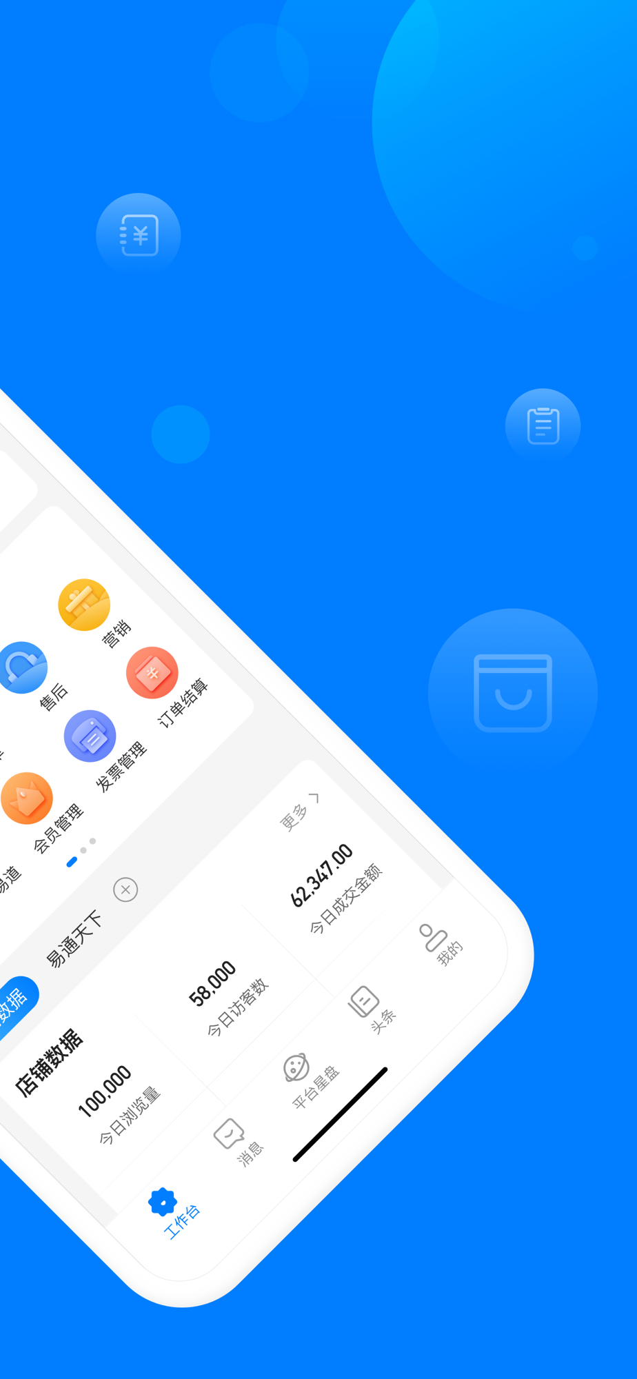 1.工作台:展示经营关键数据,今日总浏览量,今日总访客数,今日客单价等;业务模块,商品管理,交易管理,客户服务,数据报表等操作入口;