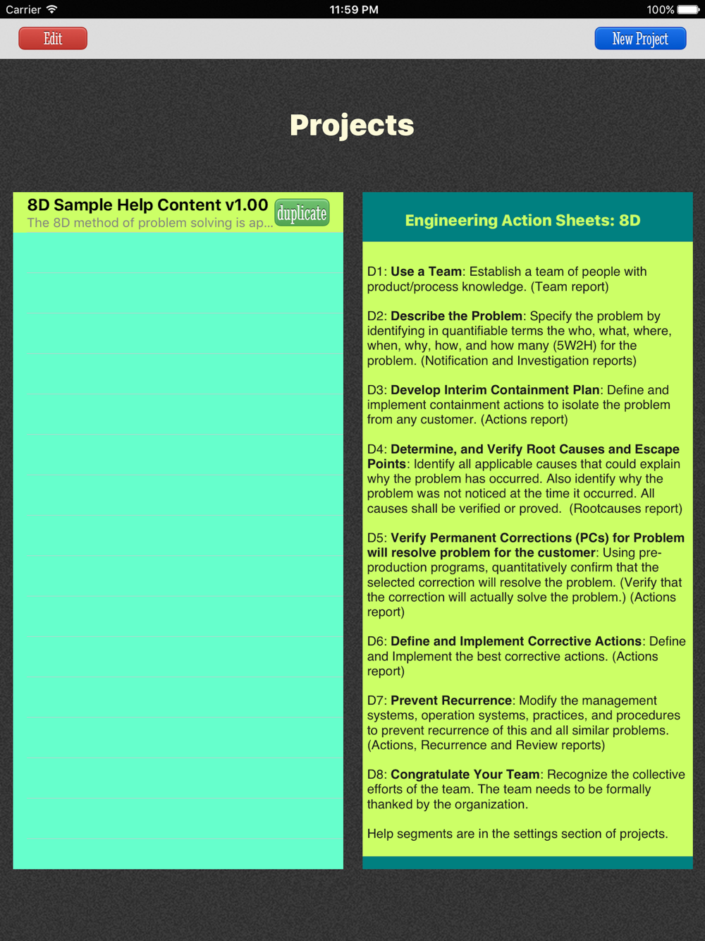 Engineering 8D is for quick and easy engineering problem solving practices and documentation. Main purpose of the app is enabling structured thinking in problem solving. It can be also used for incident reporting, quick delivery of preliminary data for urgent meetings, preparing a team list or engineering actions list and for similar actions.