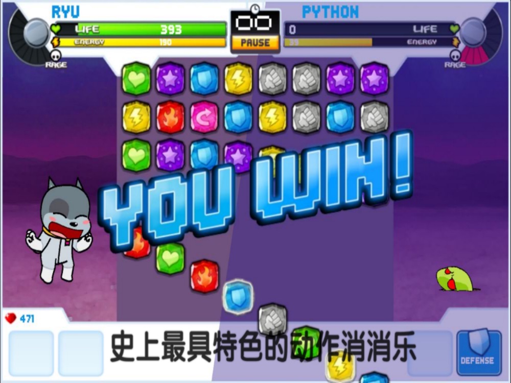 It is proud to present this fast-paced action fighter with match-3 gameplay! Featuring awesome animations, sound effects, powerups and bosses, this is sure to be one of the most intense action puzzle experiences you’ll play in a while! Choose from multiple characters to travel through space and beat up on some baddies. Make sure to keep an eye on your health and special meter to unleash the most powerful attack across the galaxy!