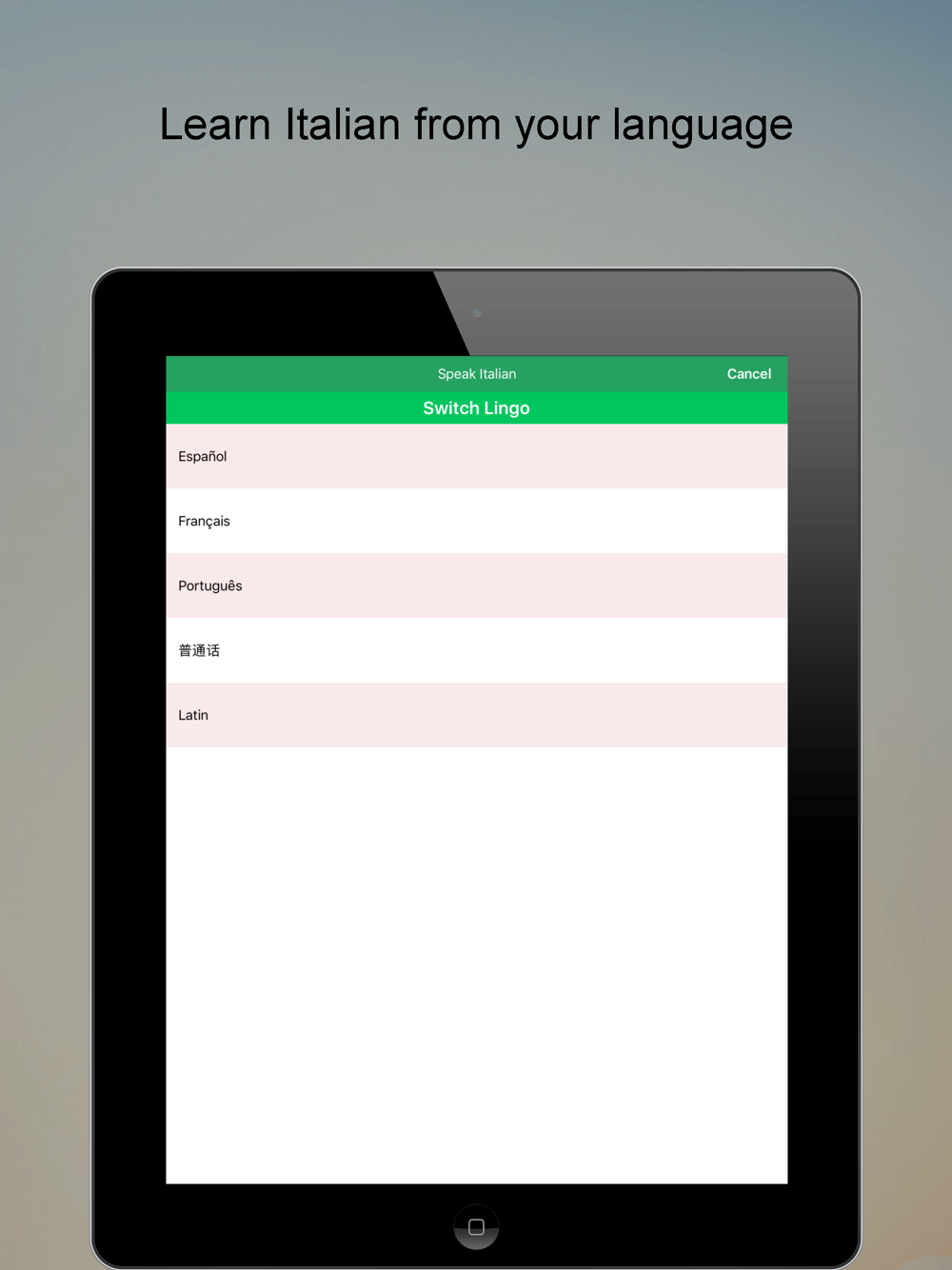 • Switch Lingo - With 5 languages to choose from, learn to Speak Italian from your language.