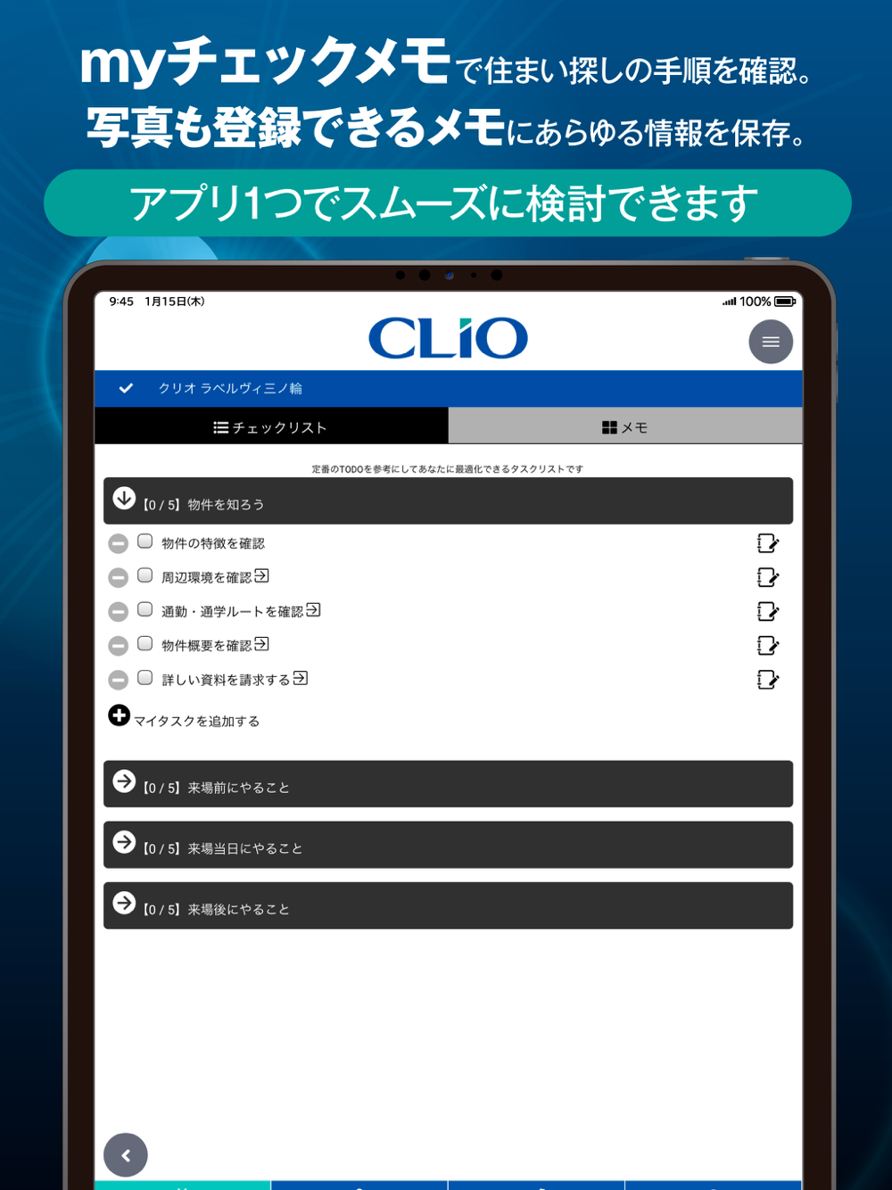 当アプリがおすすめするタスクをチェックリスト方式で管理しながら、必要に応じてマイタスクを追加したり、タスクに関連したメモを写真やテキストで保存することができます。