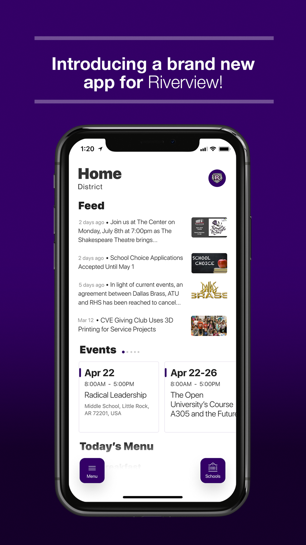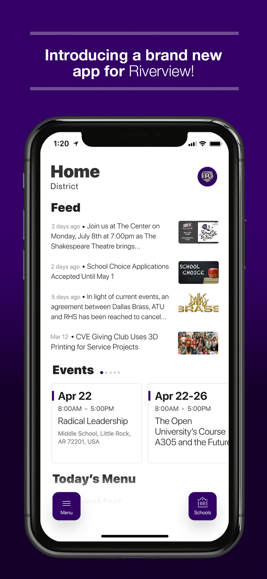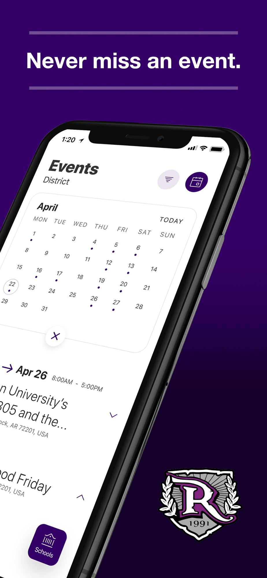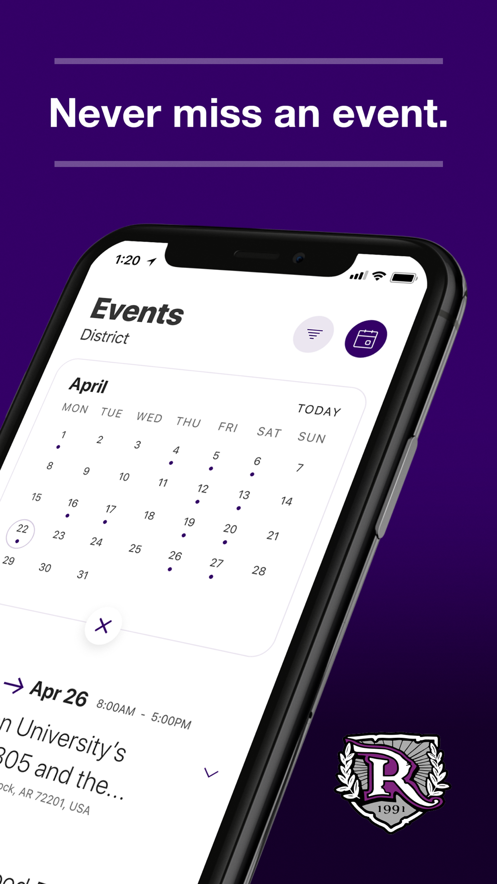 The event section shows a list of events througahout the district. Users can add an event to your calendar to share the event with friends and family with one tap.