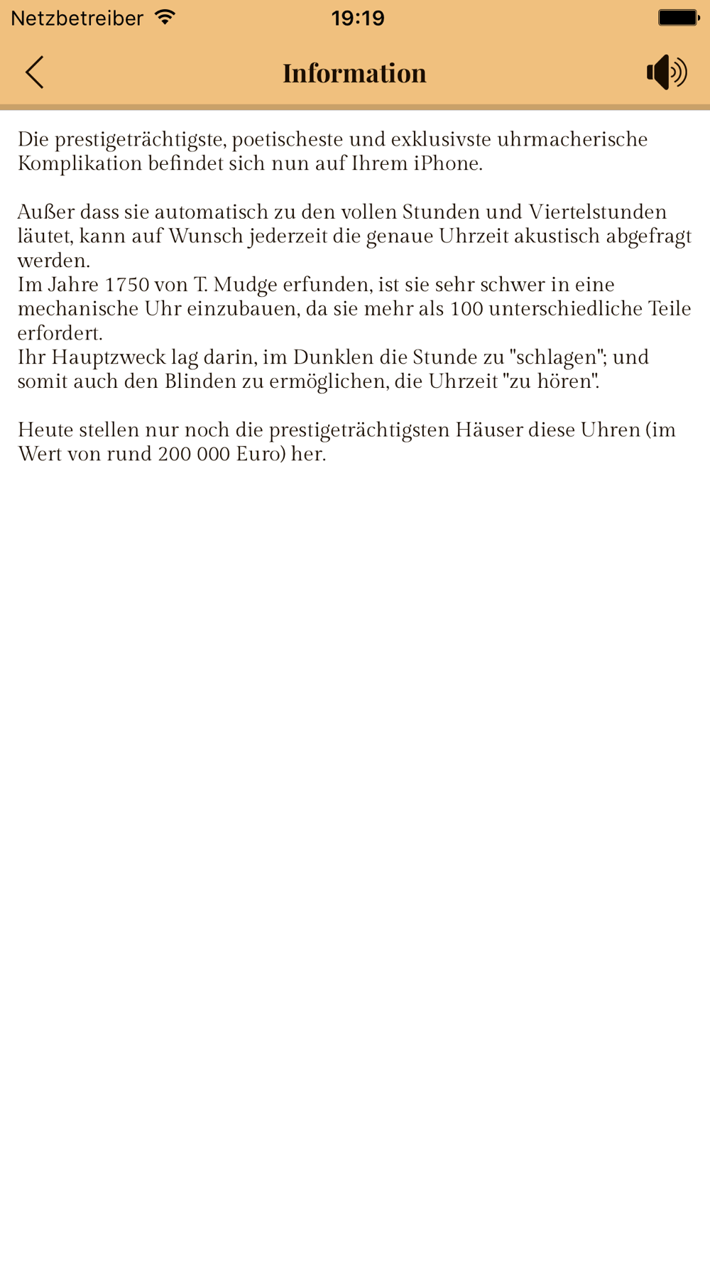 Außer dass sie automatisch zu den vollen Stunden und Viertelstunden läutet, kann auf Wunsch jederzeit die genaue Uhrzeit akustisch abgefragt werden.