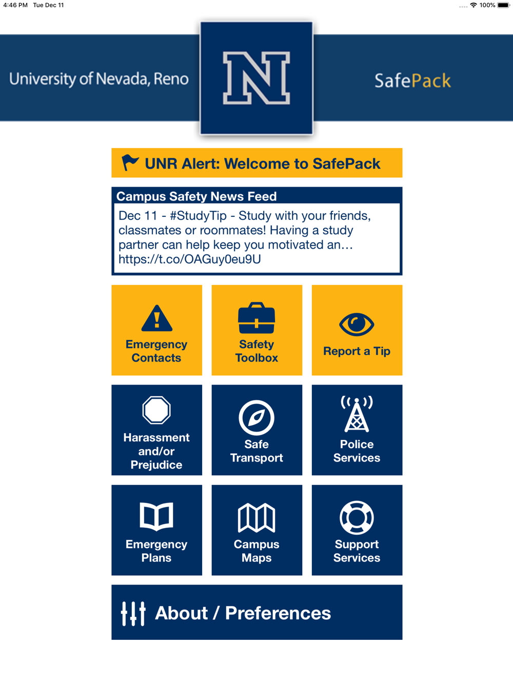 SafePack is an app developed for students and staff at University of Nevada, Reno. The app features include quick access to Campus Security, a personal safety toolbox, campus maps, on-campus support resources, and more!