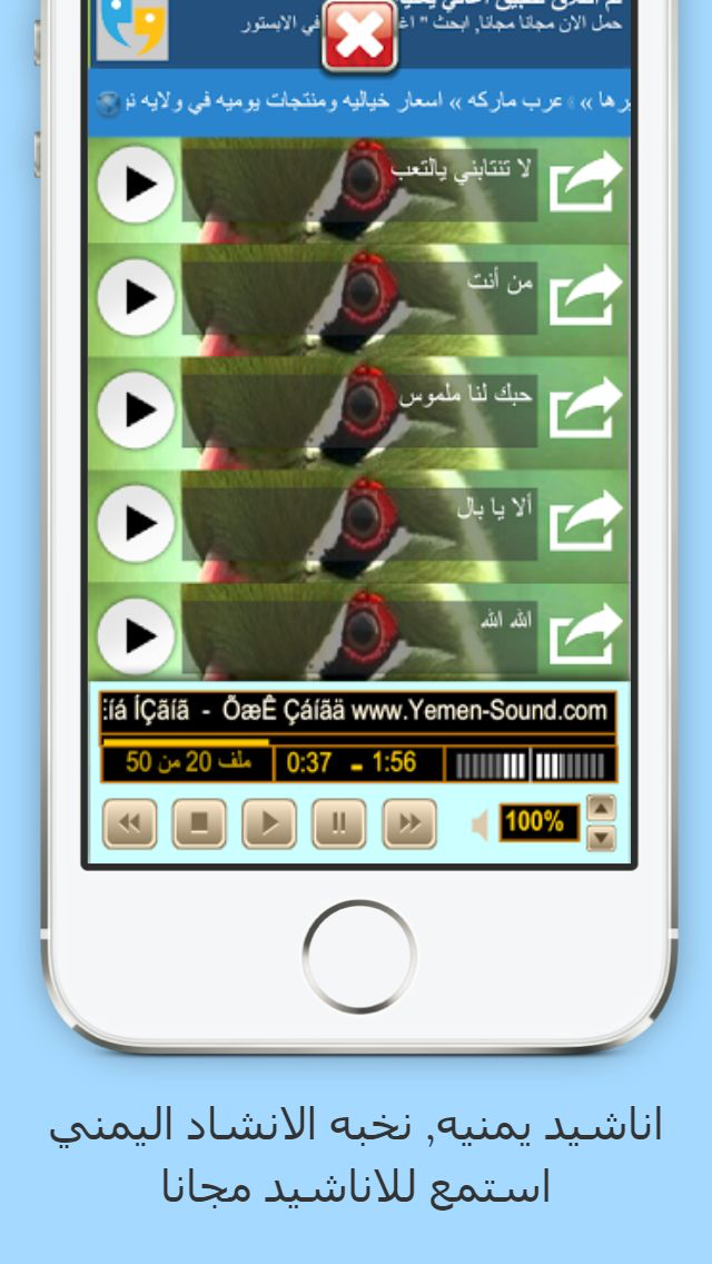 تطبيق اناشيد يمنيه يقدم لكم جميع الاناشيد اليمنيه للاستماع المجاني, نخبه من نجوم الانشاد اليمني. يقدم التطبيق اسماء المنشدين مع صور تعريفيه لهم, كما يقوم بتصنيف الاناشيد لكل منشد بصفحه مستقله.