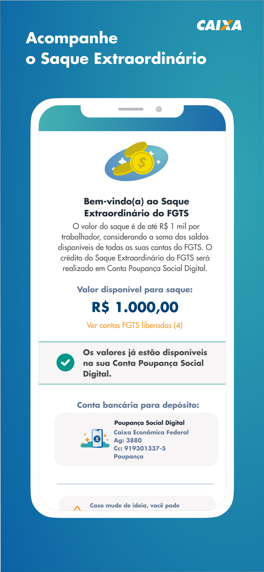 Todos os saques previstos em lei estão disponíveis no aplicativo e, caso necessite ou tenha direito, você pode solicitar no próprio App.
