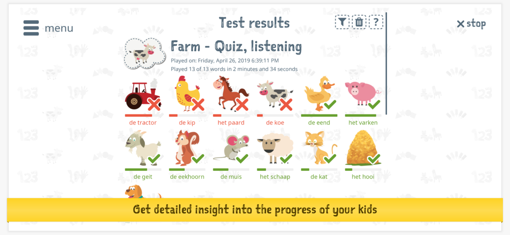Listening and reading skills of children are measured by the app, and can be viewed by parents and supervisors. The results can be viewed for a limited time only. An in-app purchase allows you to view the results of the last two weeks, and allows filtering by category and skill.