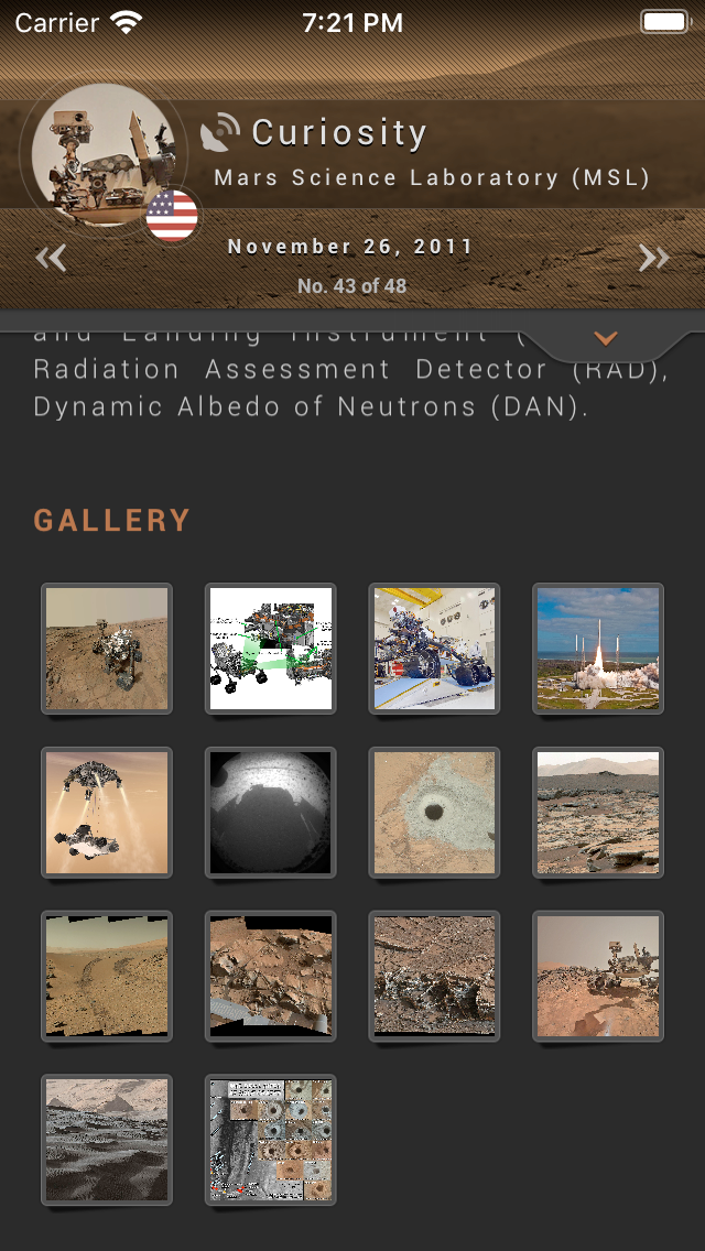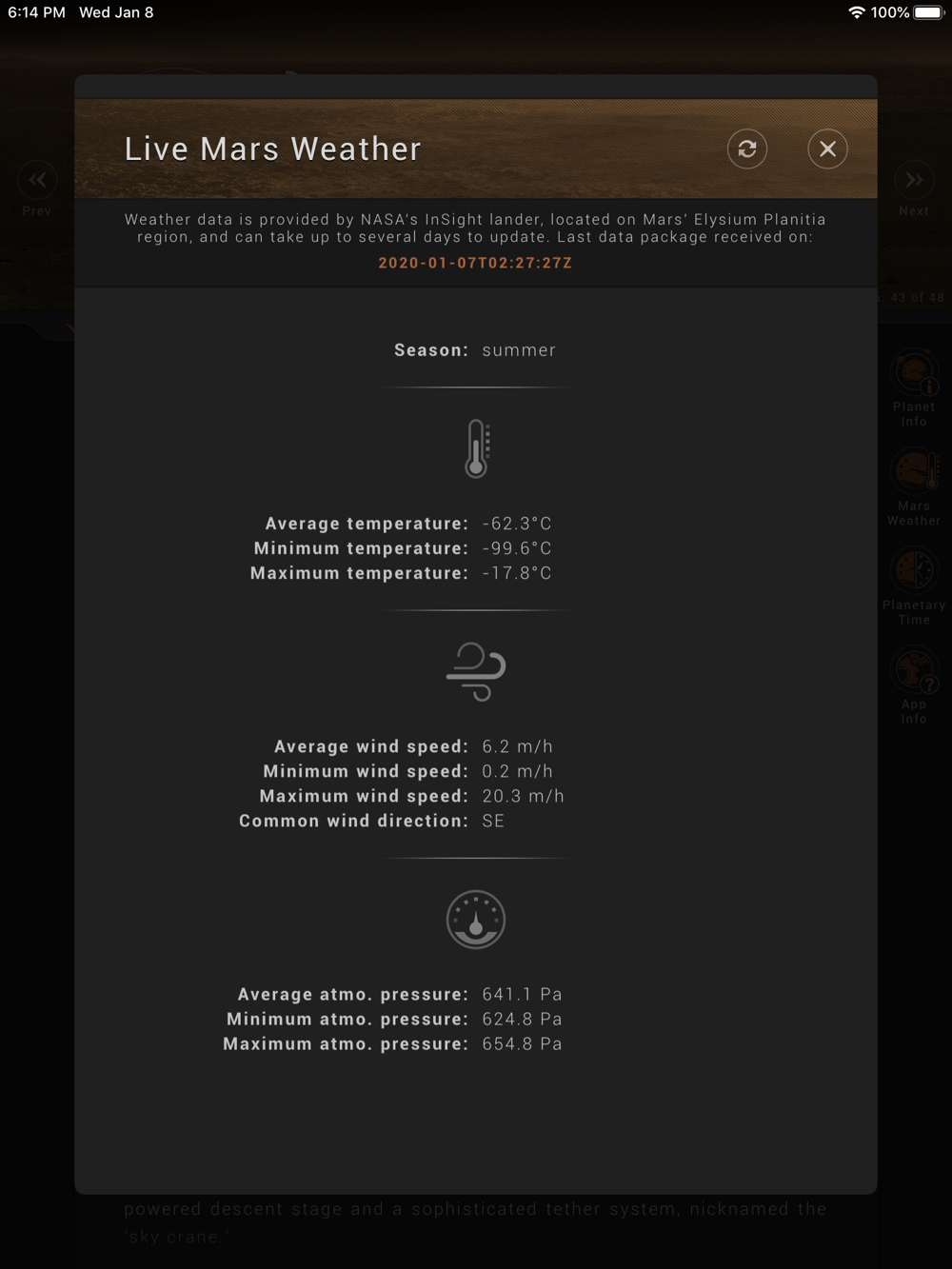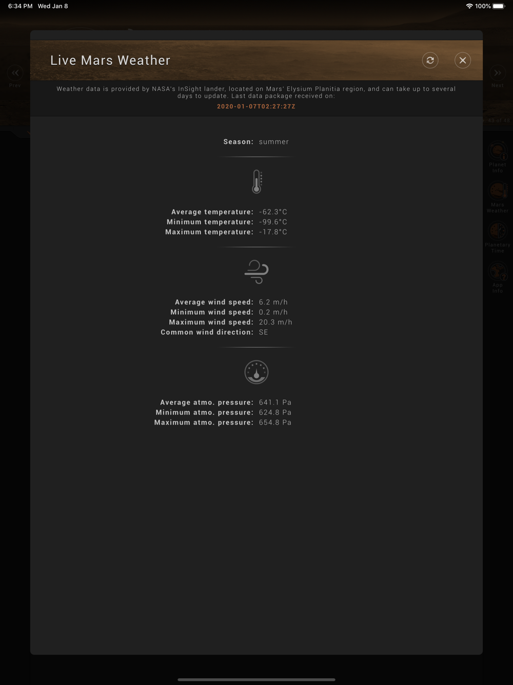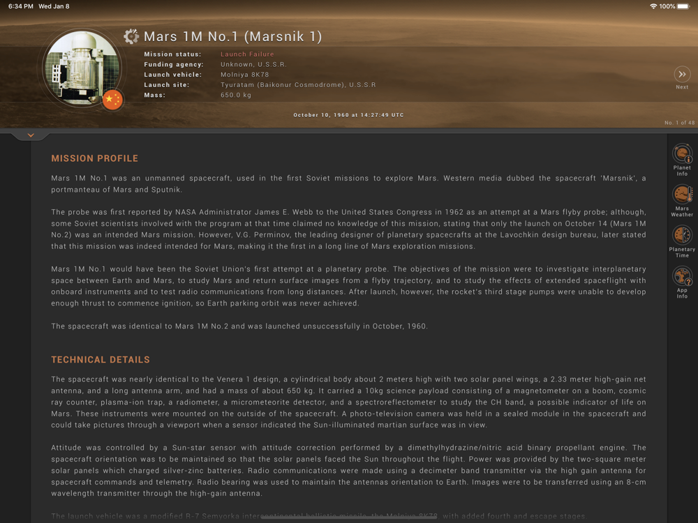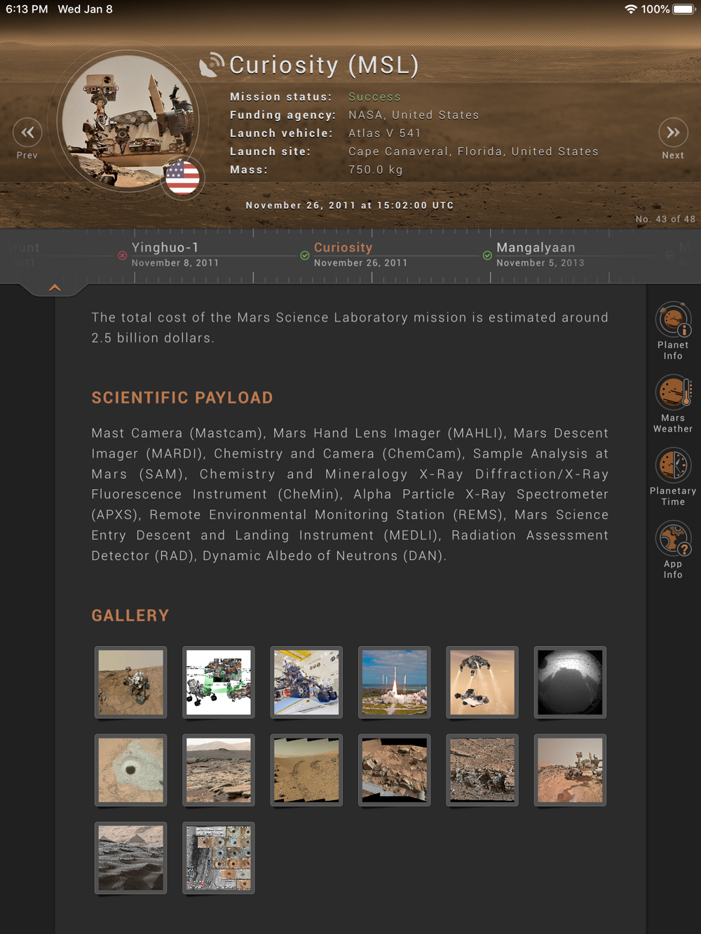 The Mars Timeline app is a tribute to humanity's effort to conquer Mars, an encyclopedia containing every mission ever sent to the Red Planet in great detail. Enjoy mission overviews, detailed technical information, and galleries of rare, historic images, as well as live Mars weather report—provided by NASA's InSight lander—and planetary clocks.