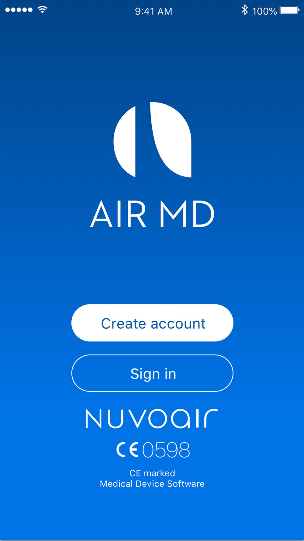 Air MD is powered by the Air Next wireless spirometer. The Air Next is a CE certified class IIa medical device. It seamlessly connects with your smartphone or tablet via Bluetooth Low Energy technology. Air Next is maintenance free thanks to the hygienic and high precision disposable turbine, there is no need for sterilisation and calibration. For more information about Air Next please visit www.nuvoair.com