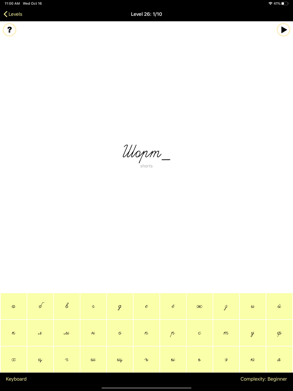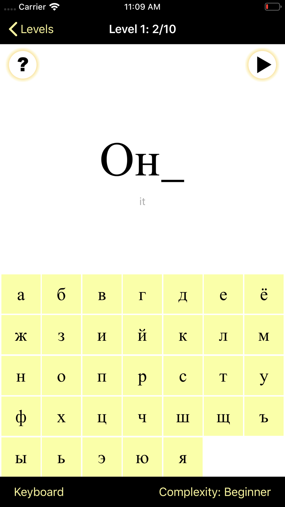 - Advanced: the words will not be pronounced at all, your challenge is to use the English translation to recall the word in Russian and spell it correctly.