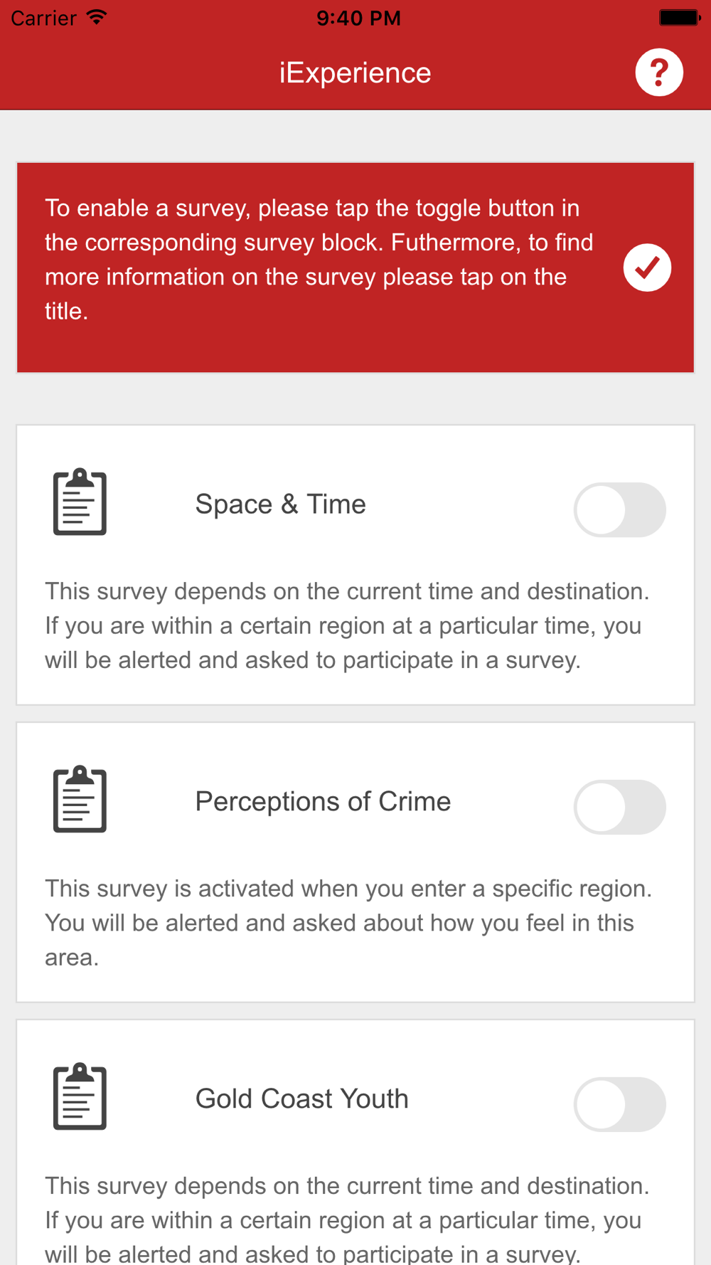 iExperience is a survey delivery platform application, developed by the School of Criminology and Criminal Justice, at Griffith University. In keeping with research protocols approved by the University’s Office of Research, faculty will use data collected from the app for academic research projects only.
