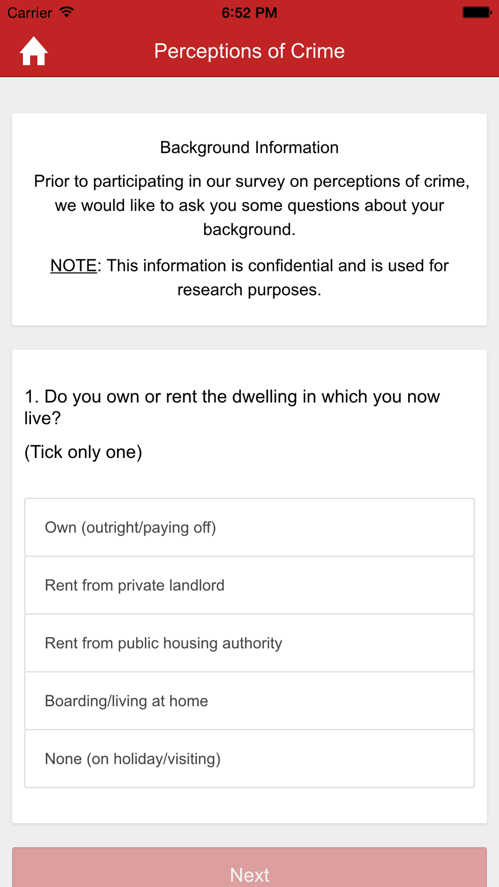 To be included as a survey participant, users must download the app and enter a 4-digit issued to eligible subjects. Users who access a survey, but who do not have the correct 4-digit code will have any data submitted destroyed. A user needs to press the toggle switch on the desired survey to activate it and enter the code. Once the code is entered, a participant will begin the survey by voluntarily completed a series of demographic questions. Demographic questions are unique to each survey contained on the app. Our approved research protocols require us to allow a participant to accept, postpone, or reject a survey even after he/she agrees to participate.
