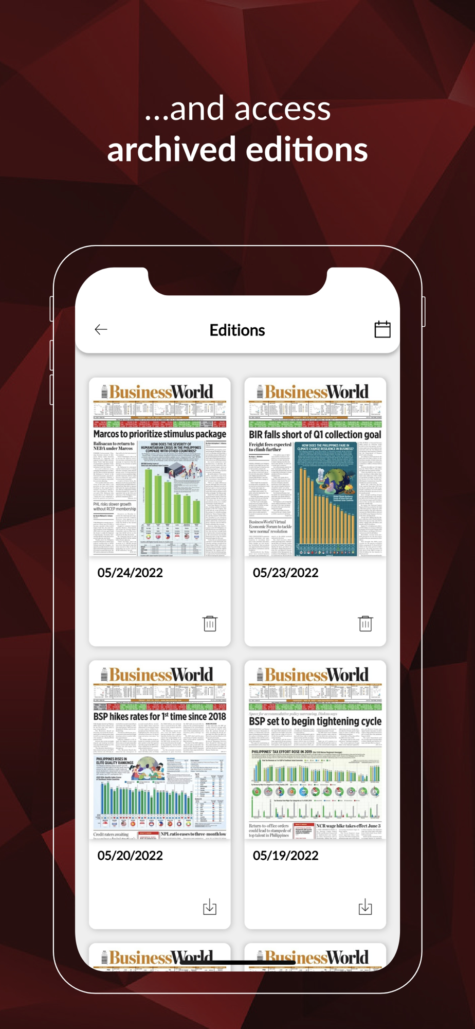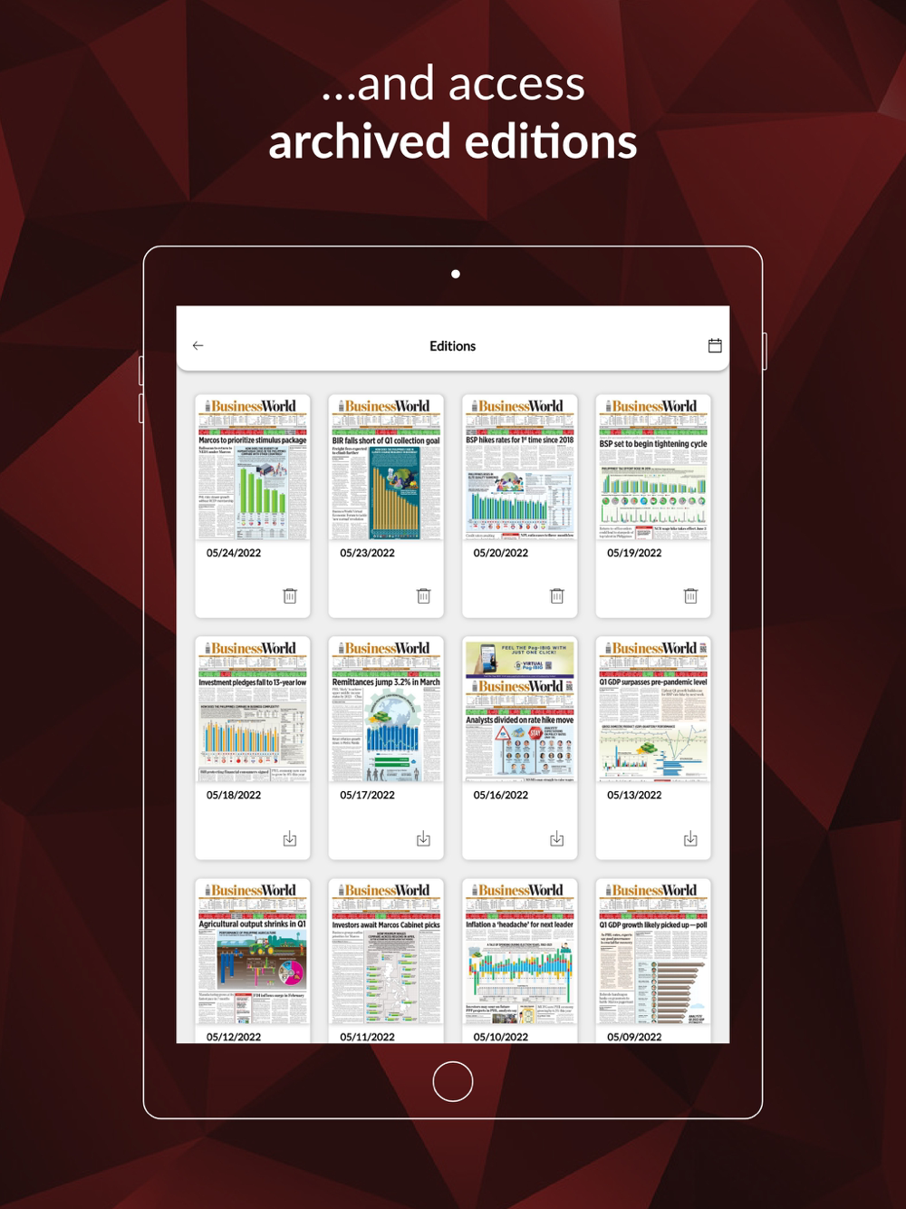 Business World provides availability to all editions of the publication by incorporating subscriptions allowing the purchase of 7 days, one month, 2 months, 3 months, 6 months and a yearly subscription to the paper.