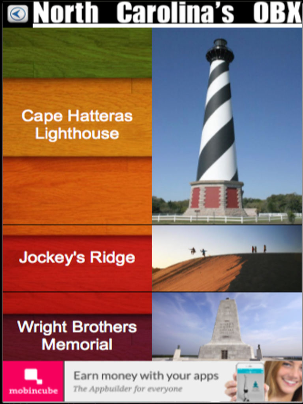 The OBX Tourist Destinations App is an interactive mapping application of the top tourist destinations in the Outer Banks (OBX) of North Carolina. The map features address, information and contact information as well as pictures and detailed information on the specific attraction. The locations are listed below that are included in the application.