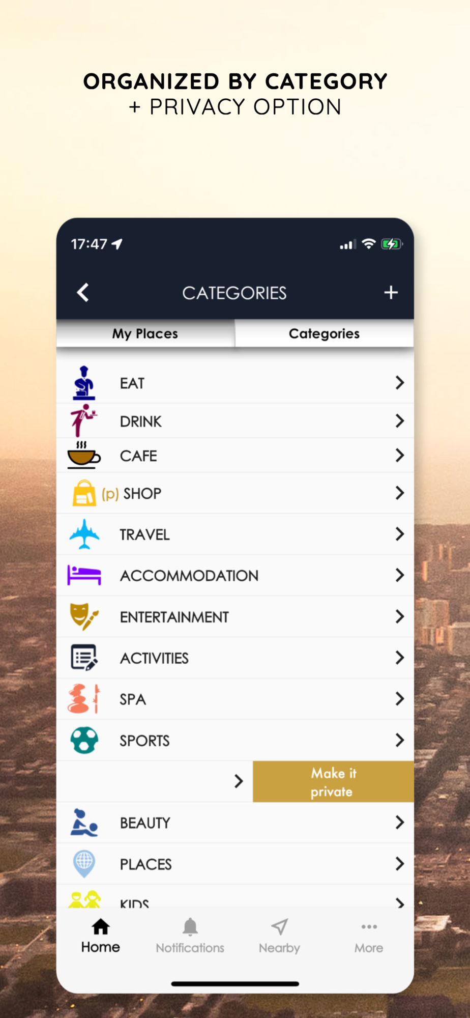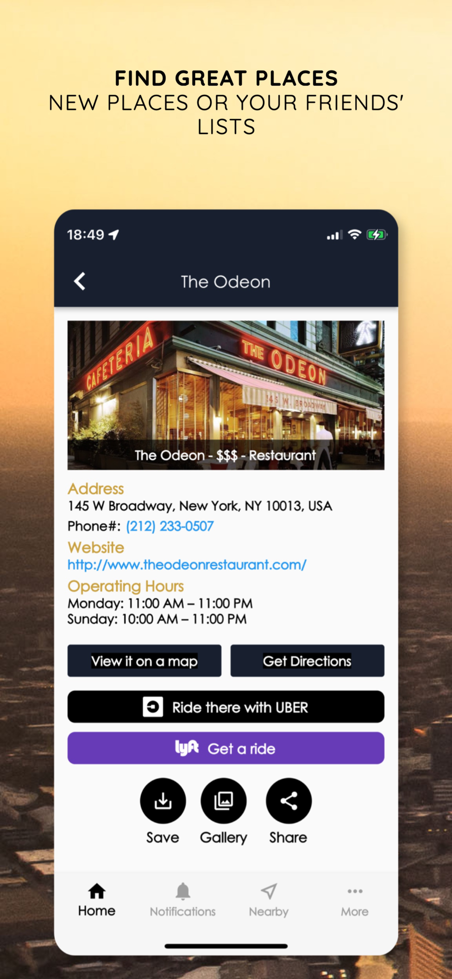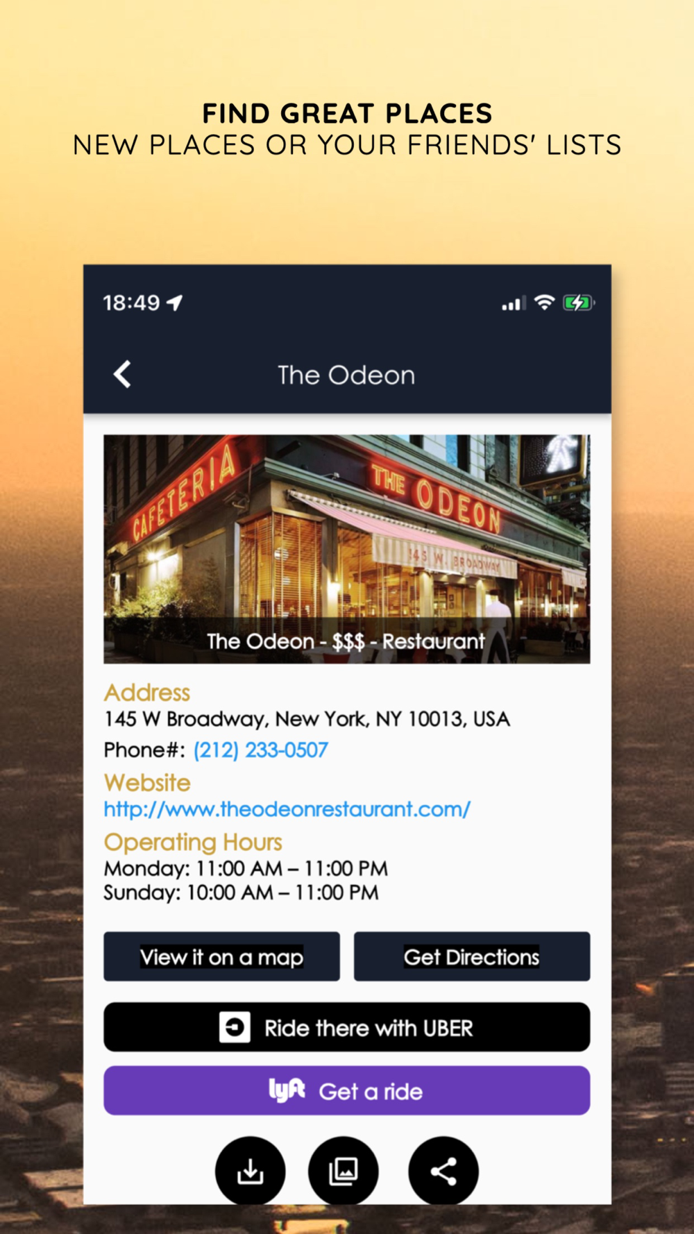 - Share recommended places to friends: email, Instagram, Pinterest, Facebook, Twitter, text message, and private in-app share