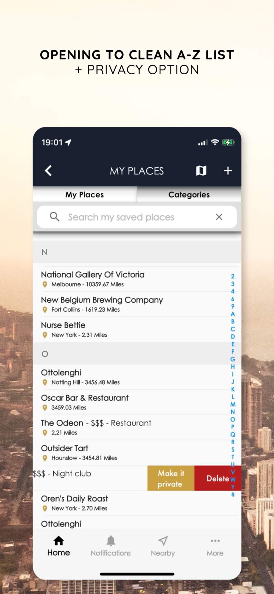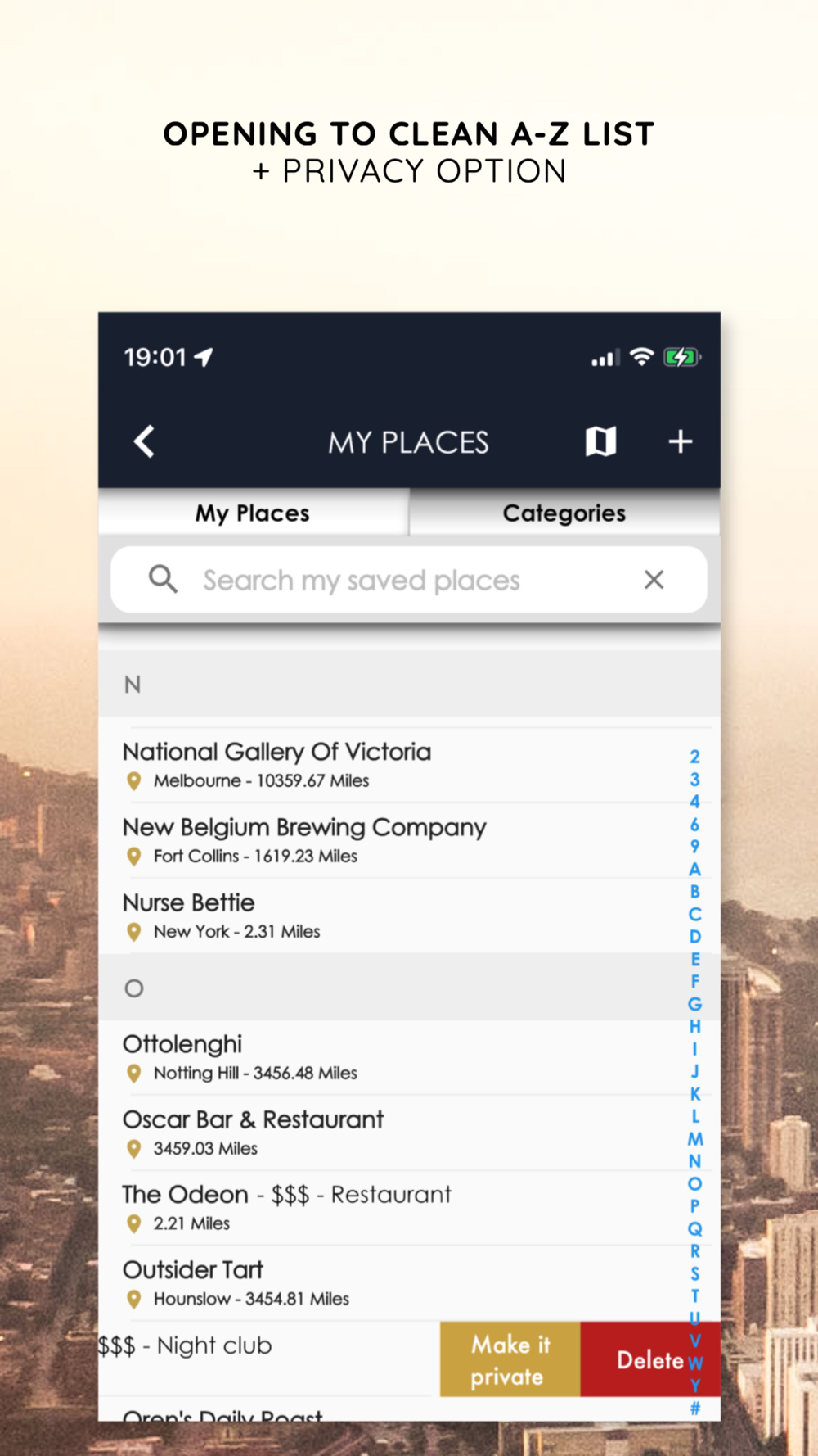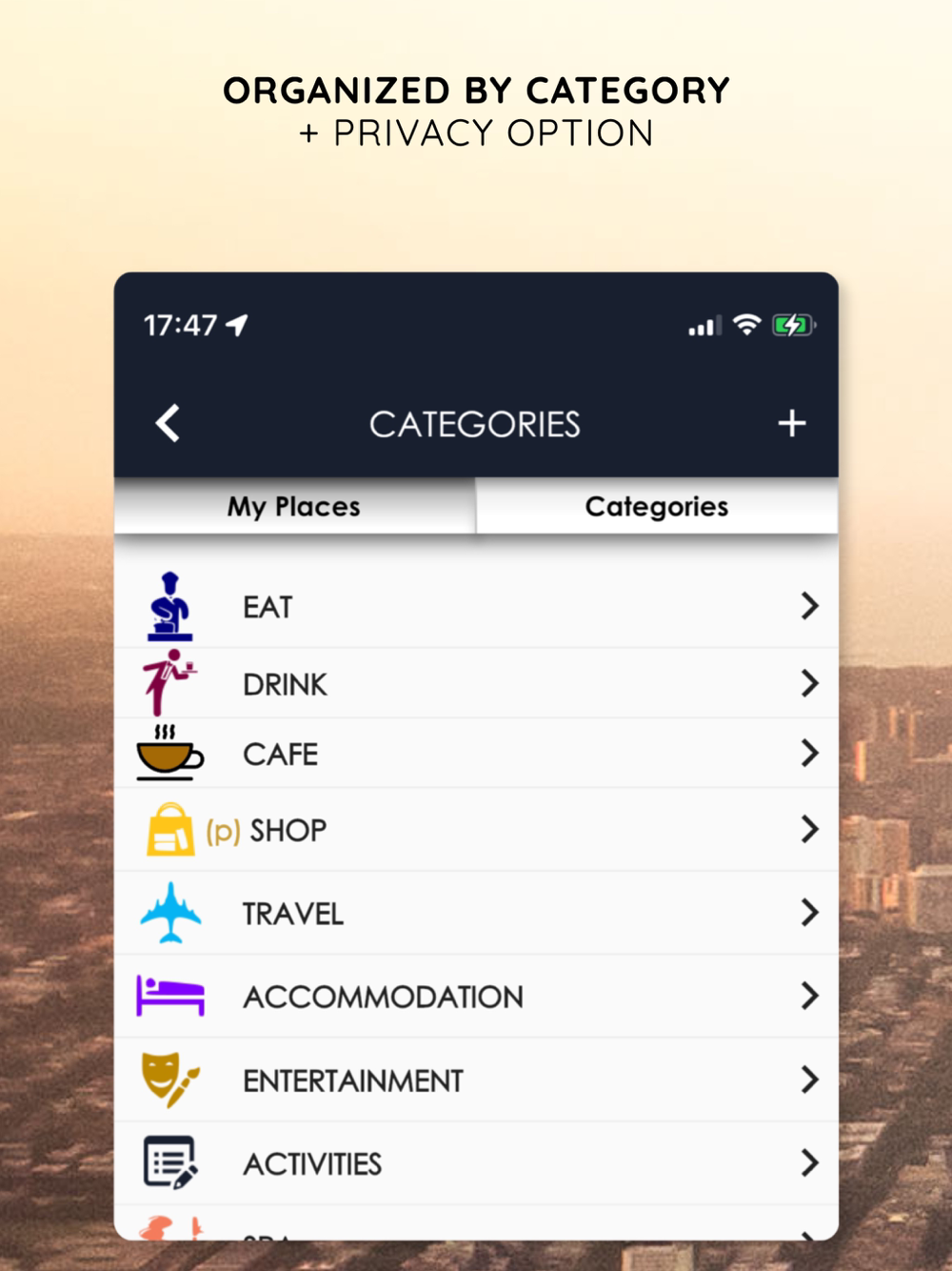 - Organize your places! MFP automatically saves your favorite places in an A-Z list and by Category
