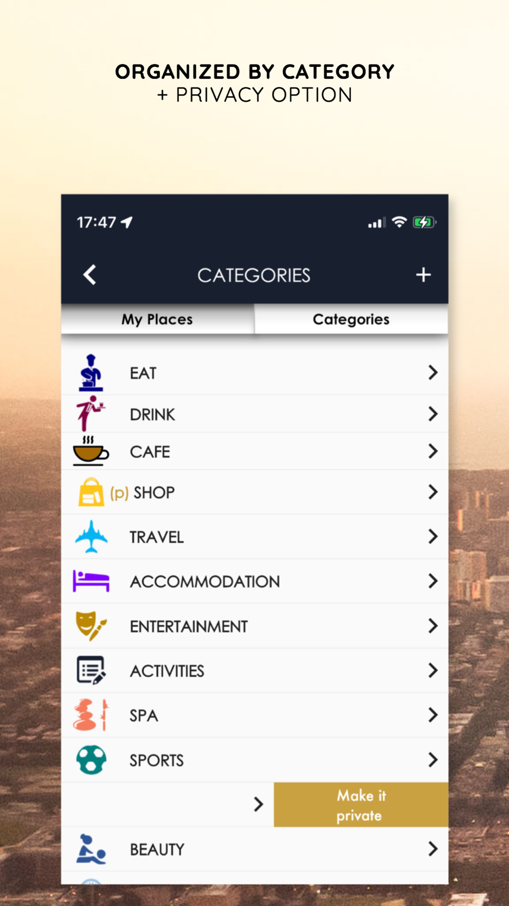 - Privacy: you can opt to make saved places or categories only visible to you and private from Followers. Individual followers can be blocked too
