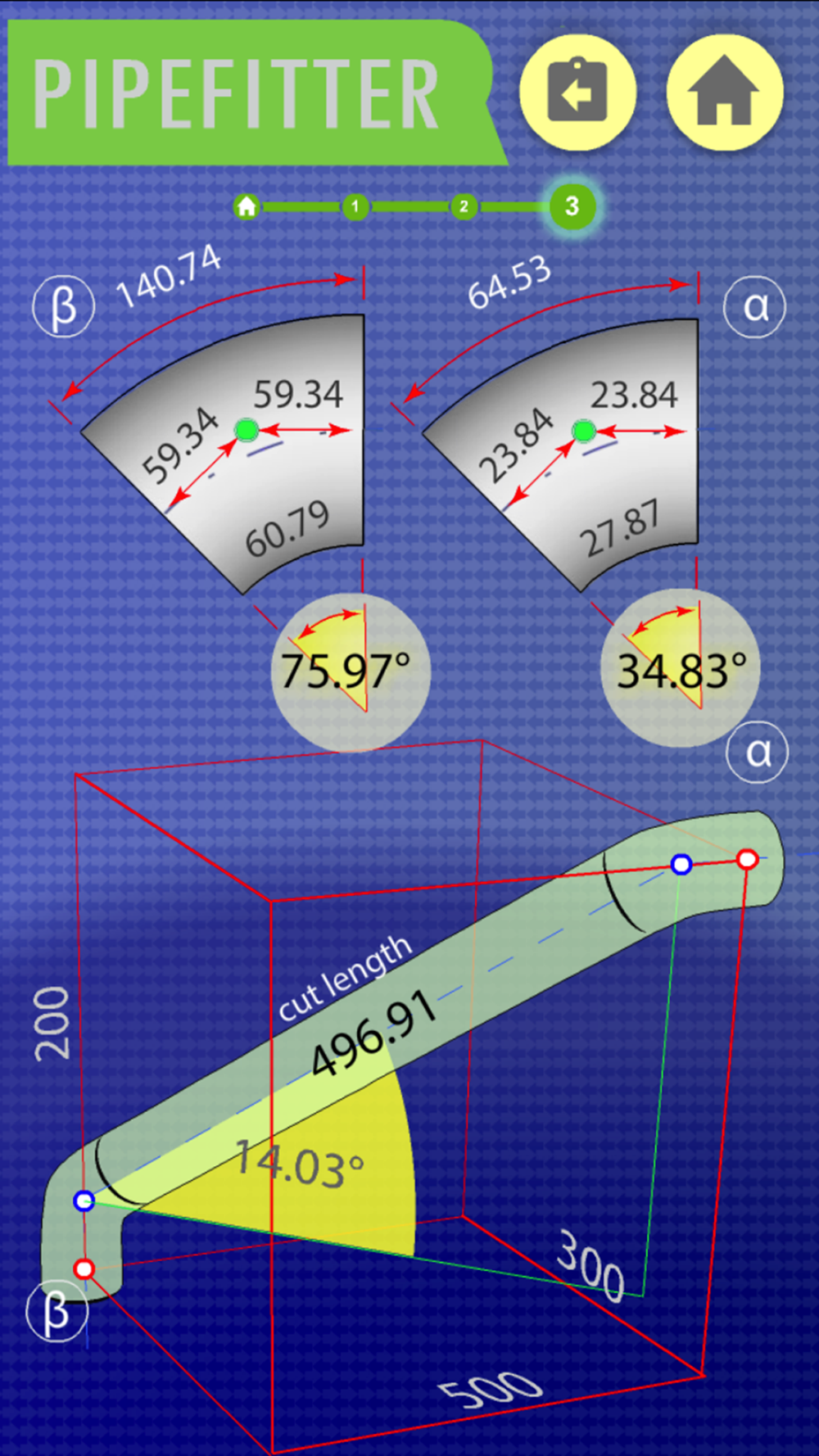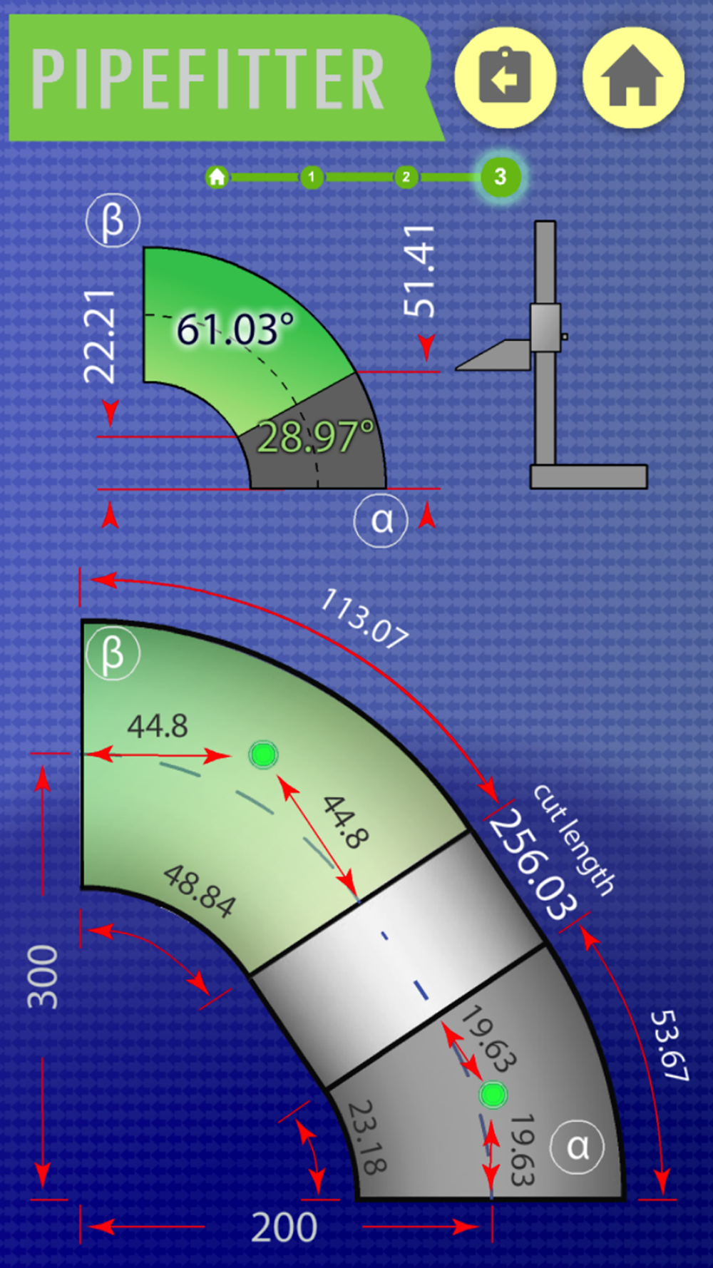 Application Pipefitter allows you to calculate odd angles, elbows, tees, problematic offset pipes and mark them with measuring tape, caliper or height gauge on the work bench. You can measure everything in a simple way: from "face to face", or ”center to center”, and quickly get the solution in the App. Standard pipe sizes and long radius elbows (including ANSI and DIN) can be selected from the list of up to 40 inches.
