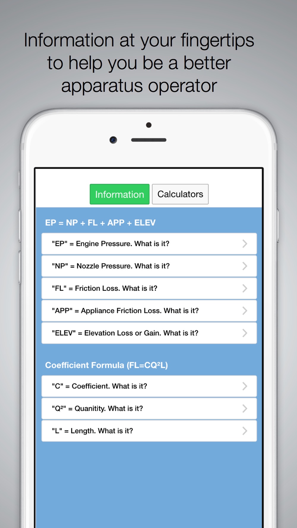 An application that will help you perform every pump operators basic equation. EP = NP + FL + APP + ELEV, you will be able to easily calculate the total Engine Pressure (EP) needed based on your inputs as well as: