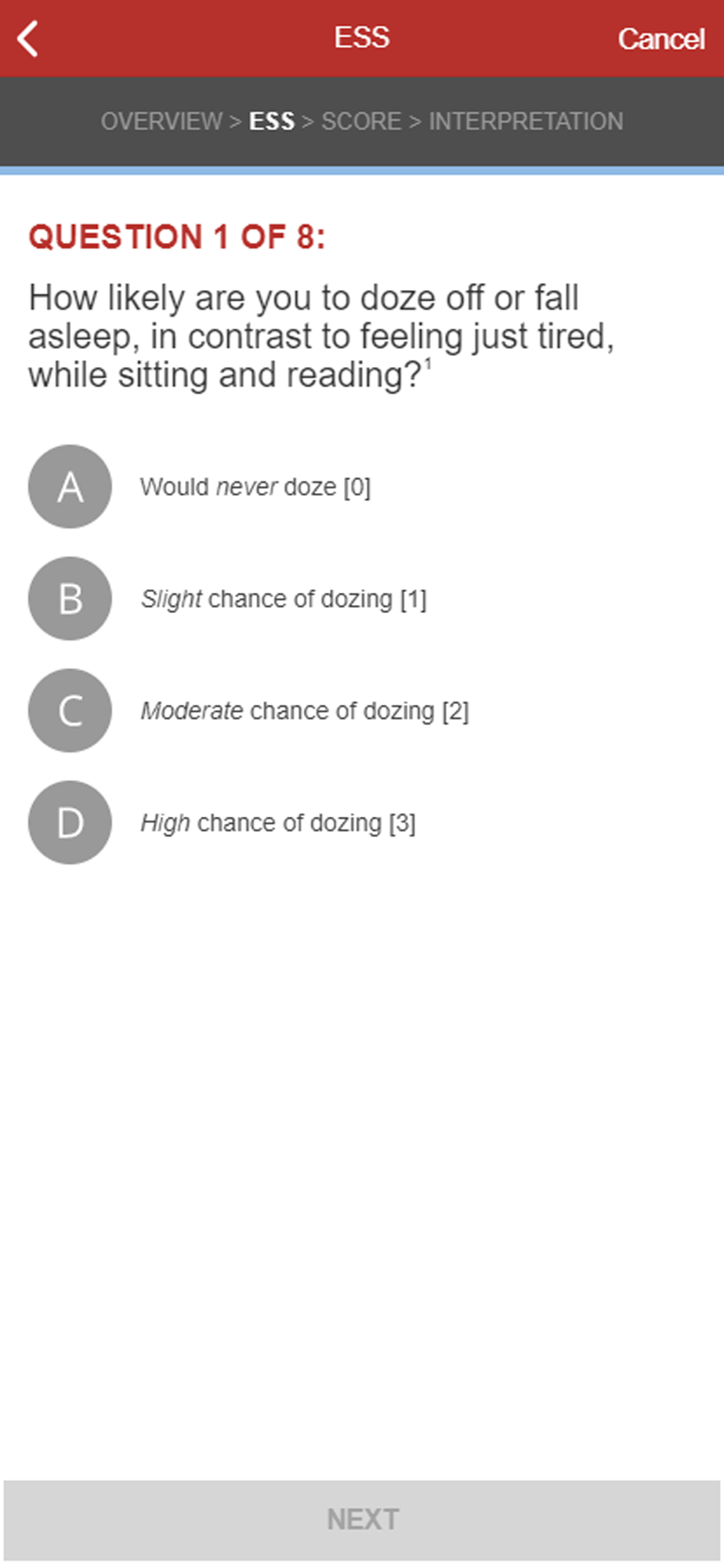 The Narcolepsy Screener App is designed to provide doctors with two validated screening tools that can help screen patients for excessive daytime sleepiness and narcolepsy with cataplexy.