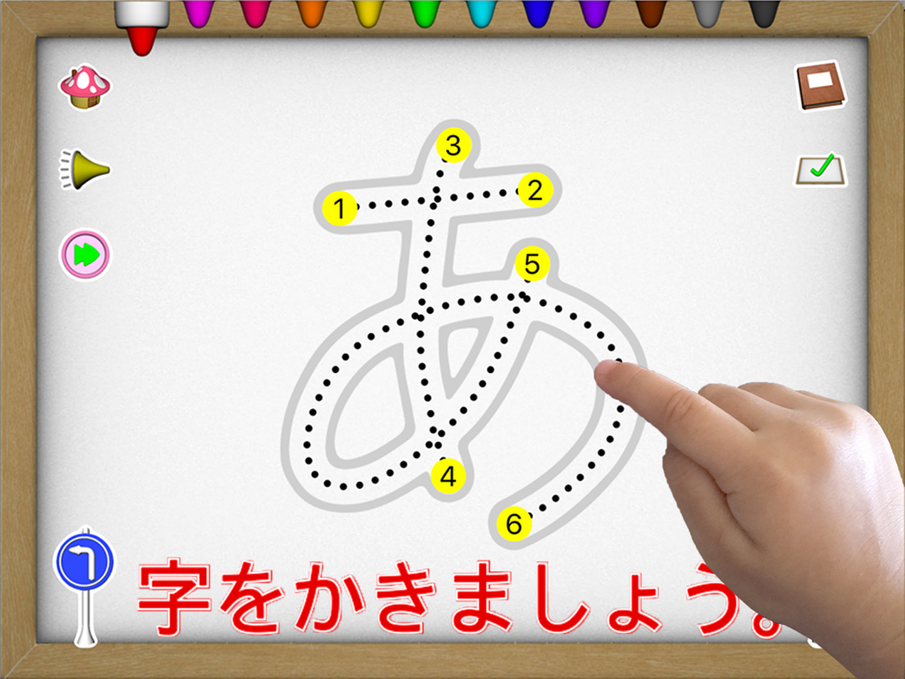 子供たちに ひらがな、カタカナ、数字、漢字(アップグレード必要)の 点線のシミュレーションに付いて書き方がわかる。書いた字が正しくチェックすることもできる。
