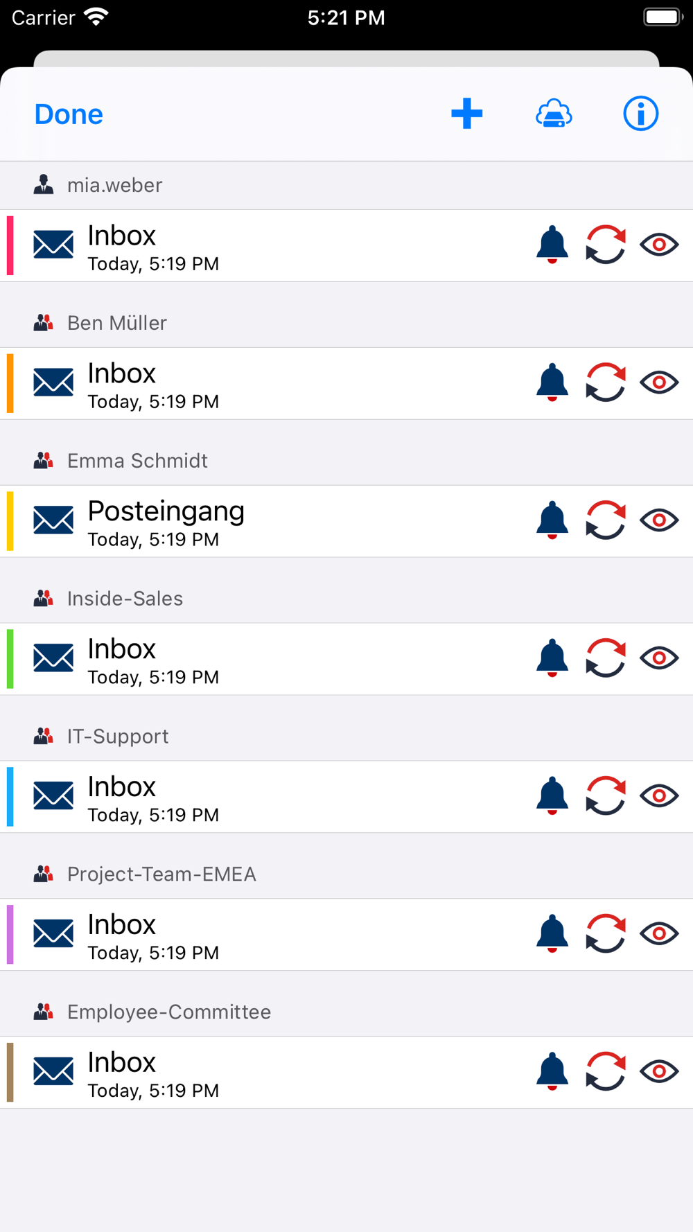 • Only 3 default folders for the master account (inbox, contacts, calendar)