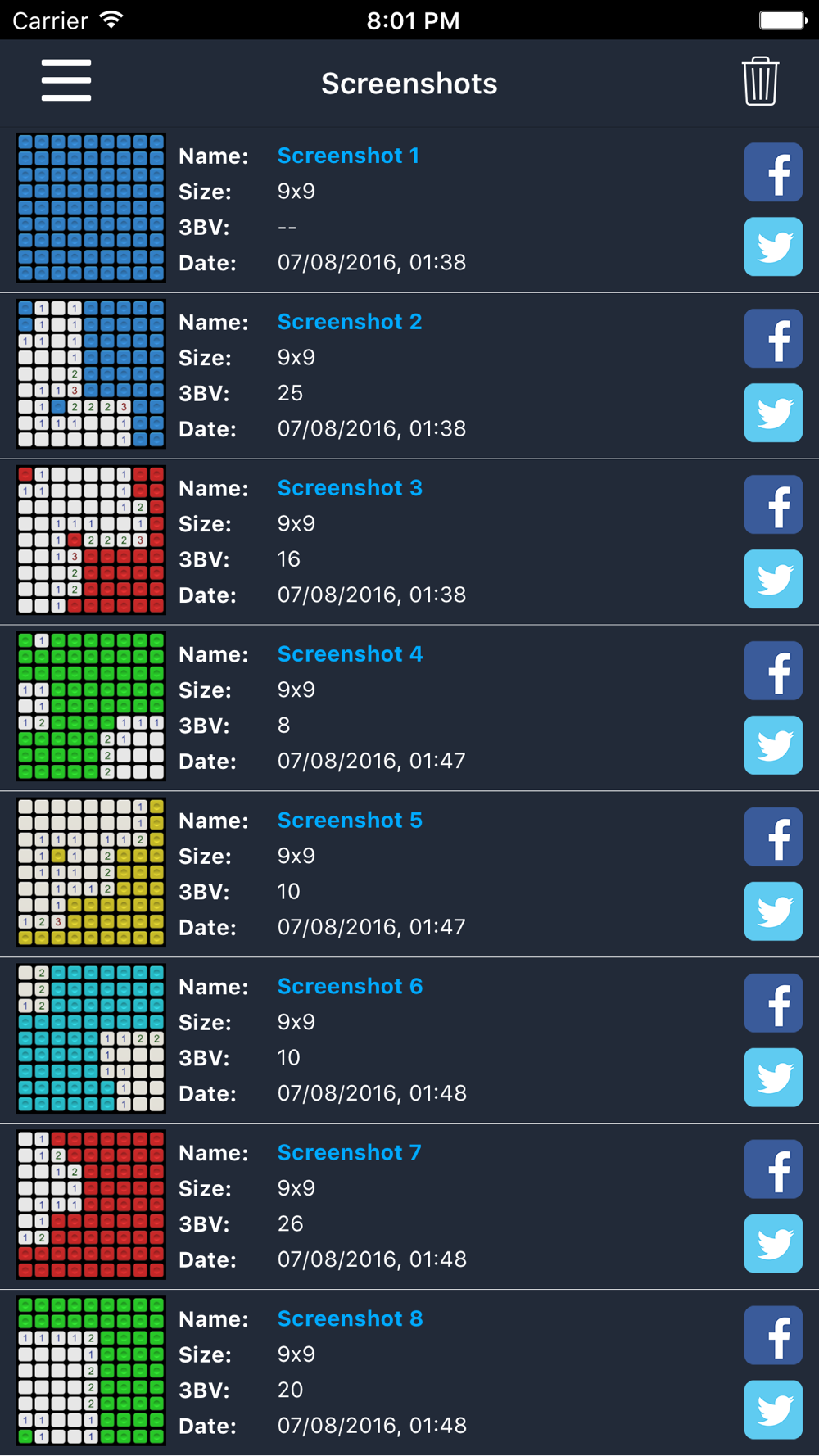 You can choose a standard game or create a custom one, generate a screenshot of the game board and share it with your friends via social networks.