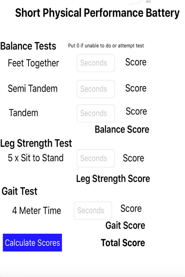 Use this app to calculate the results for the SPPB functional test. No longer do you need to remember the cut-off times for each score.