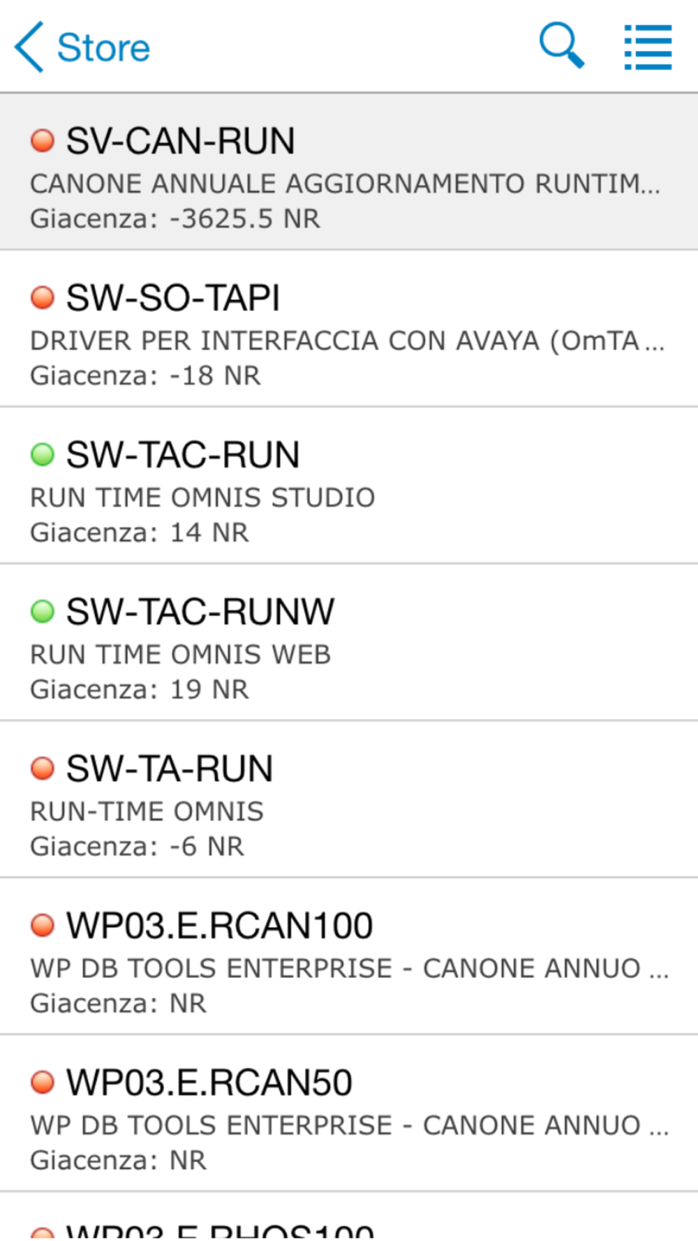 Visualizzazione dettaglio articoli con giacenza, impegni attivi, impegni passivi e prezzo di listino.