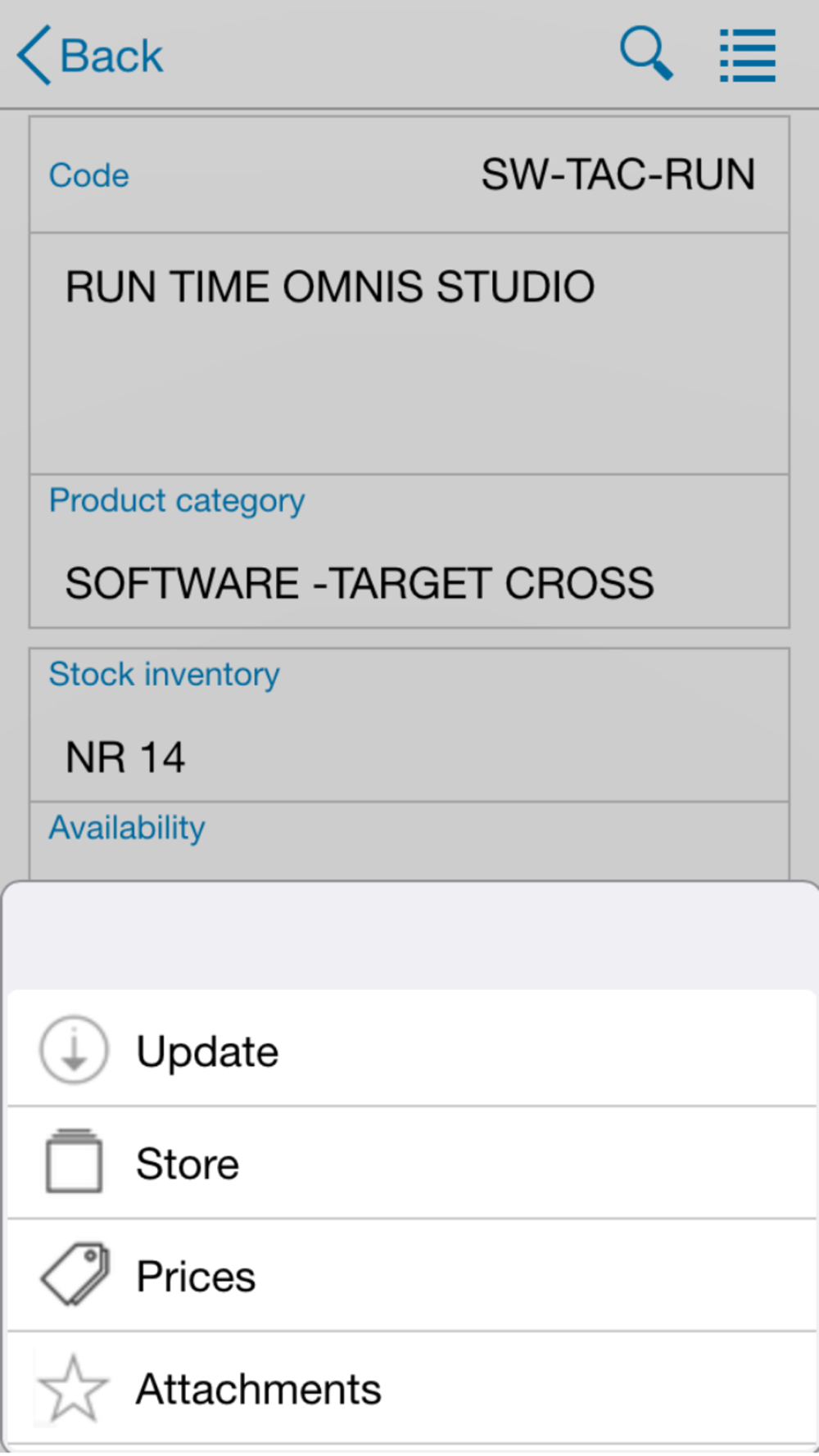 Menù di contesto per accedere ai dati di dettaglio relativi a giacenze di magazzino, prezzi di listino e allegati (immagini e file)
