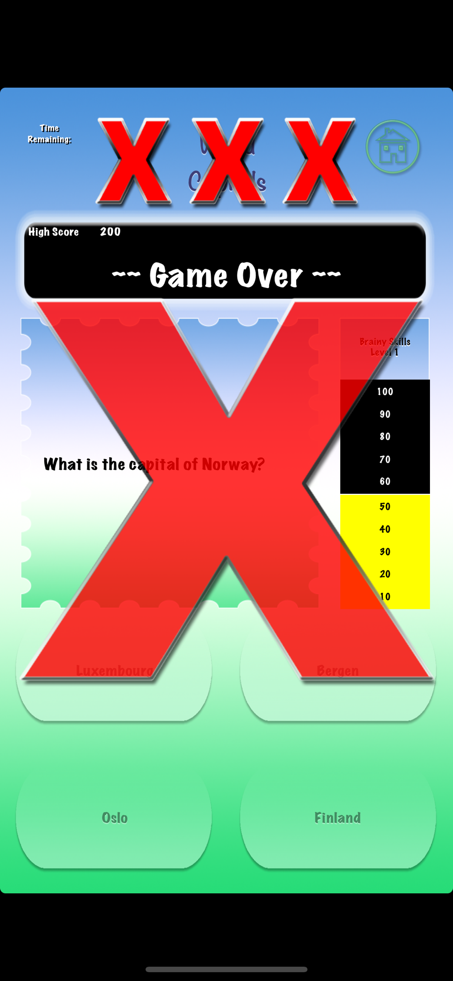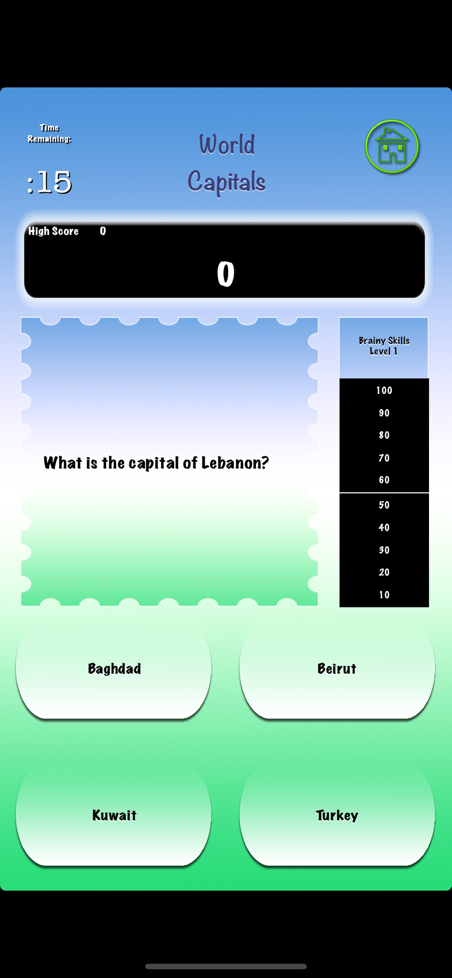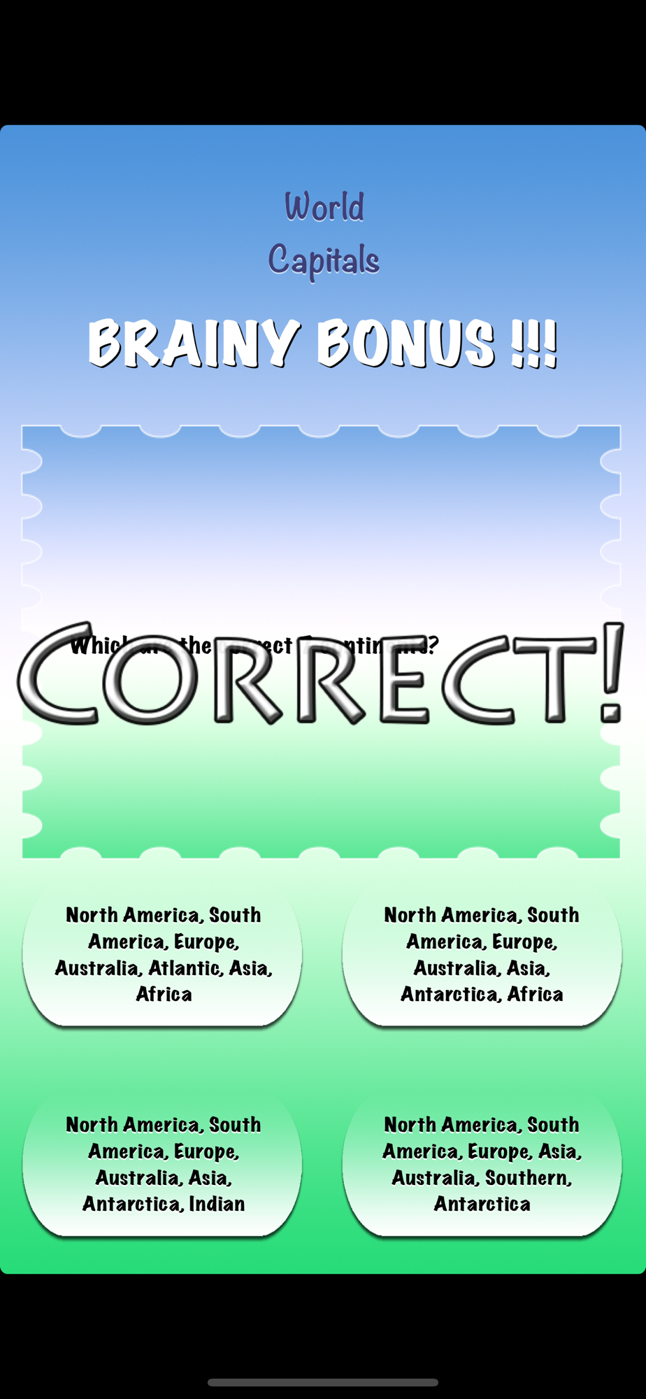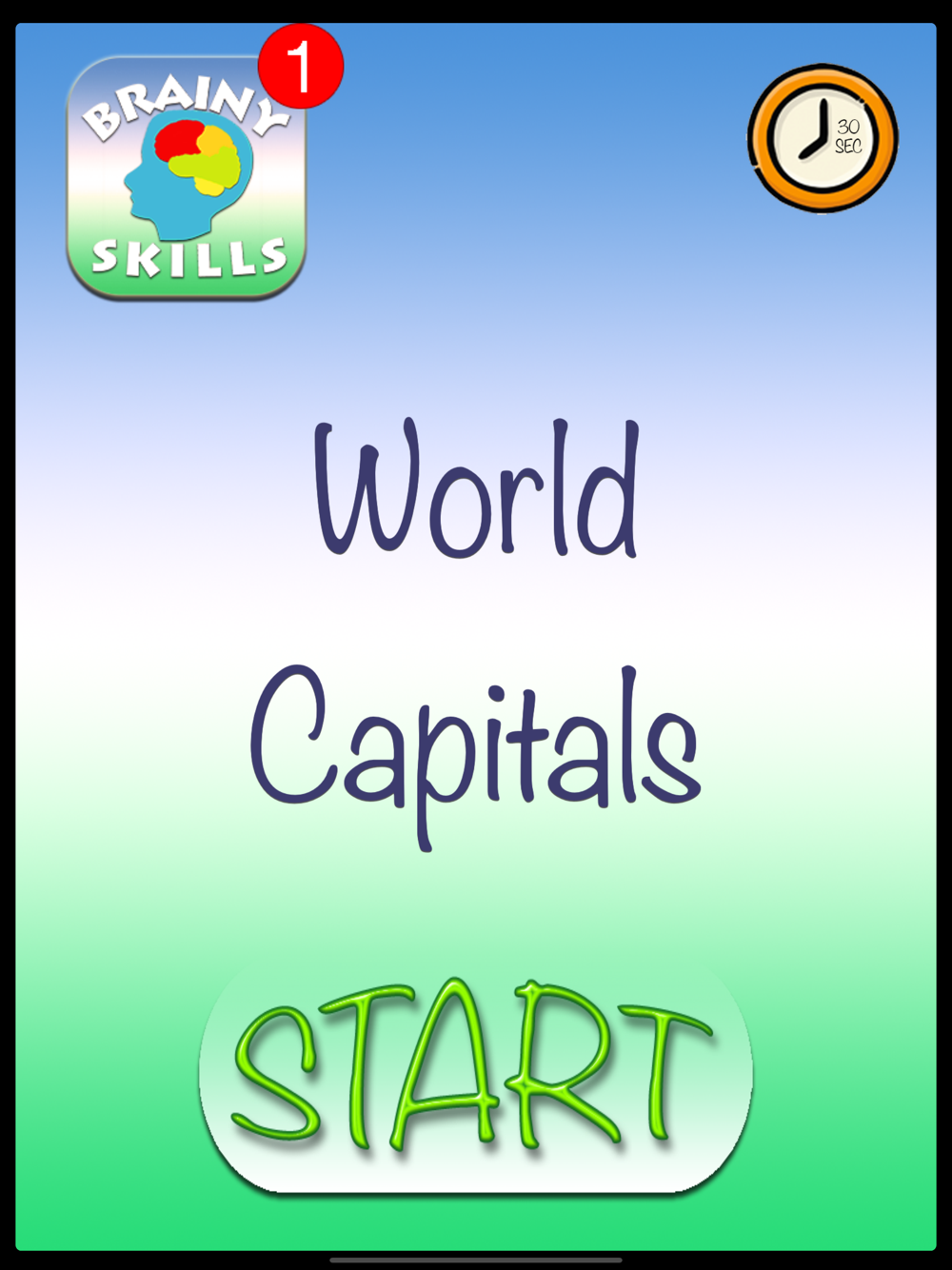 This app was created, developed and written by a former teacher with the assistance of a certified Speech Language Pathologist (SLP) with many years of hands on experience in a variety of settings from daycares, schools, and preschools with a large variety of both younger and older school age children, both typically developing and special needs children. After seeing the difficulties and struggles with answering a variety of questions, the great need for a unique, motivating, fun and exciting way to help improve these skills was obvious. There is a need to combine learning with fun in order to improve and increase motivation when grasping concepts such as basic geography, reasoning and matching skills. This app can also be used for practicing reading, memorization, and overall comprehension skills for middle and high school special needs students and those looking for remedial practice. Match the capitals and countries to various multiple choice options, while working your way up the scoreboard for points. It’s that easy! Motivate your child to beat their score each time they play and get to the highest score. There are also Brainy Bonuses that at times are tricky to teach and review the core material.
