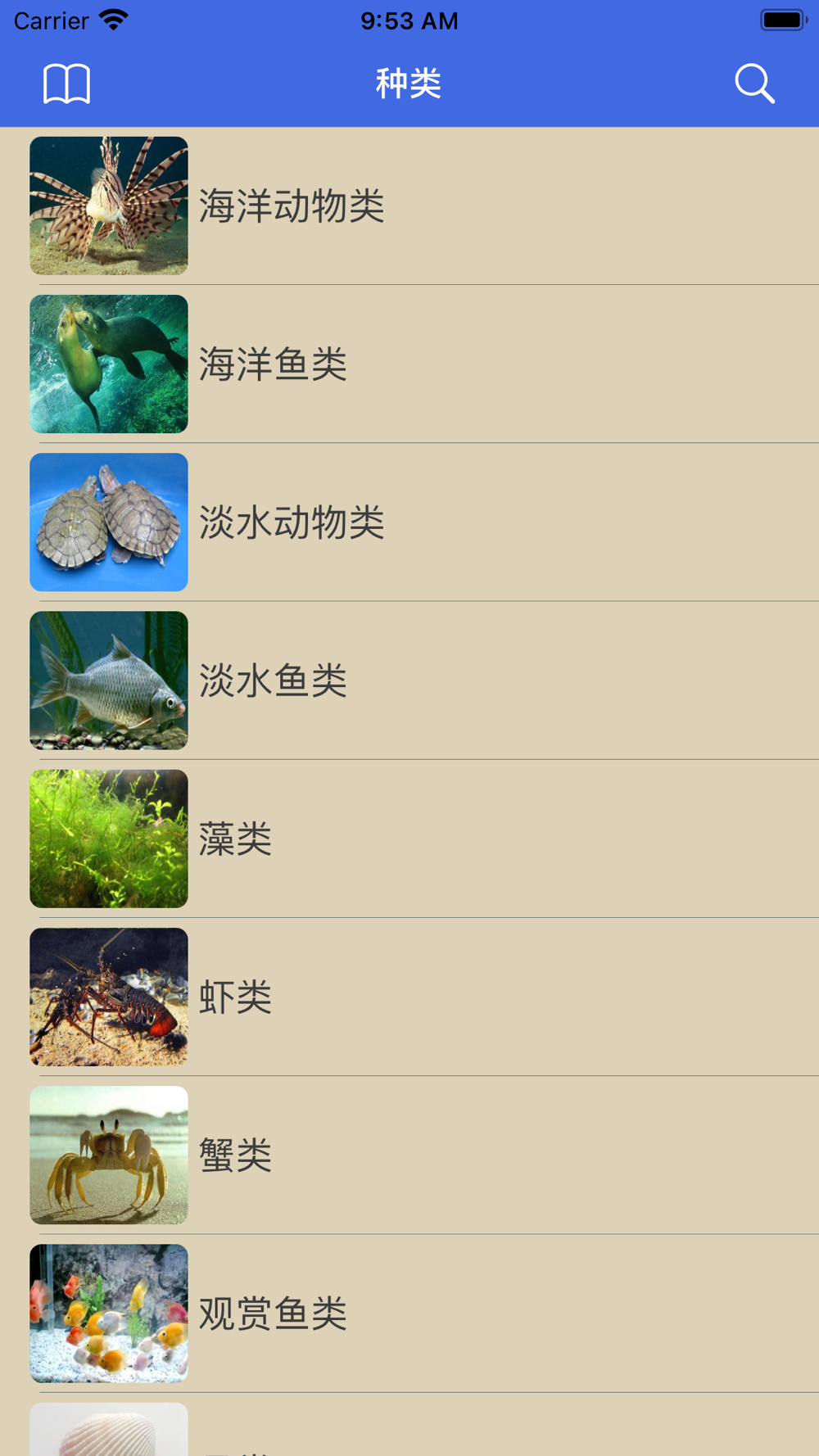 本应用主要收录了各种鱼类百科知识,共一千四百条鱼类,并分为九大类,包括海洋鱼类,淡水鱼类,贝类等分类,每个鱼种类都配有图片,可作鱼类图鉴,并且每个鱼类都有详细说明,包括分布情况,种类,身体形态等内容,本应用还附带有收藏,复制等功能,非常方便用户使用。