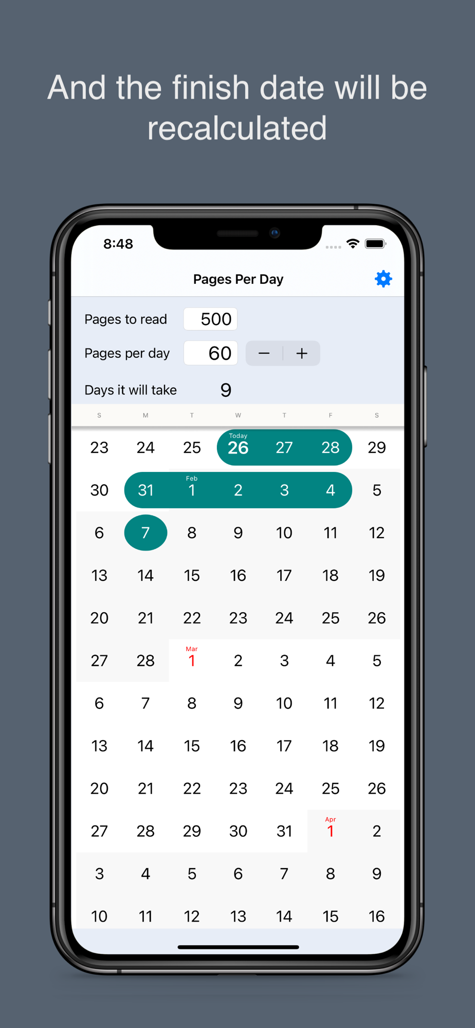Simply enter how many pages you read per day and the calendar will show when you'll finish.